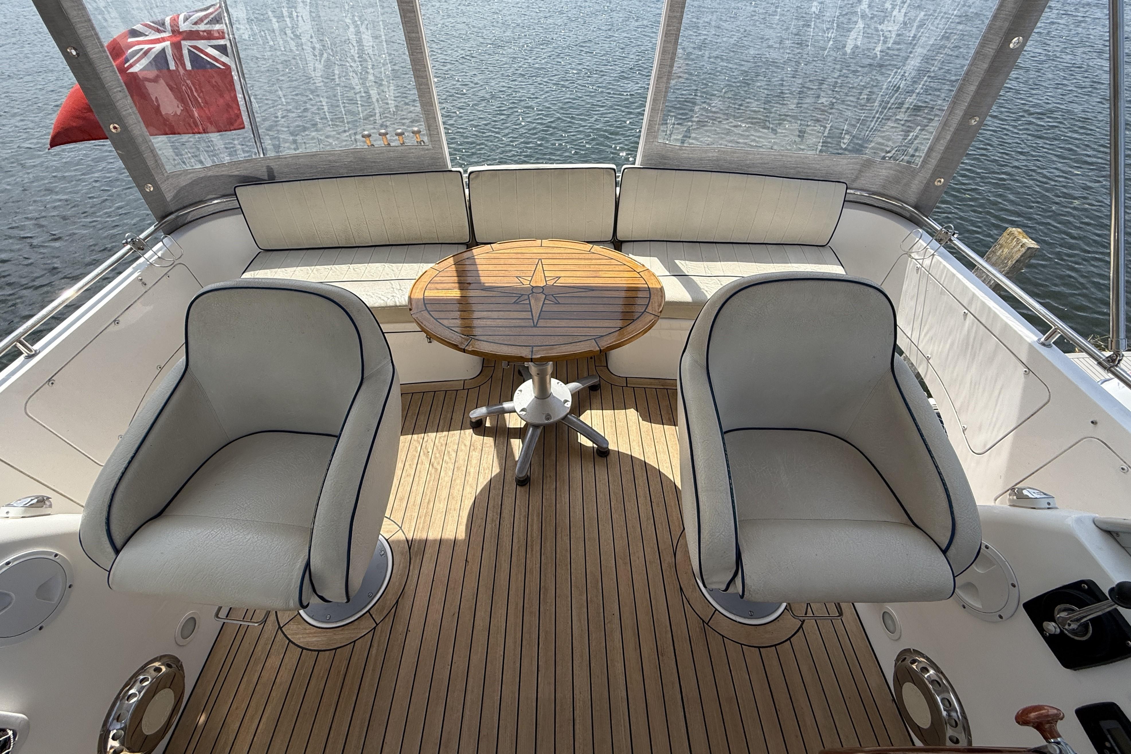SALOON - corner seat to port, full length cupboards with shelves, stairs to aft deck, U-shaped settee to starboard converting to double berth with storage underneath, height adjustable large table, opening sunroof hatch with blind.