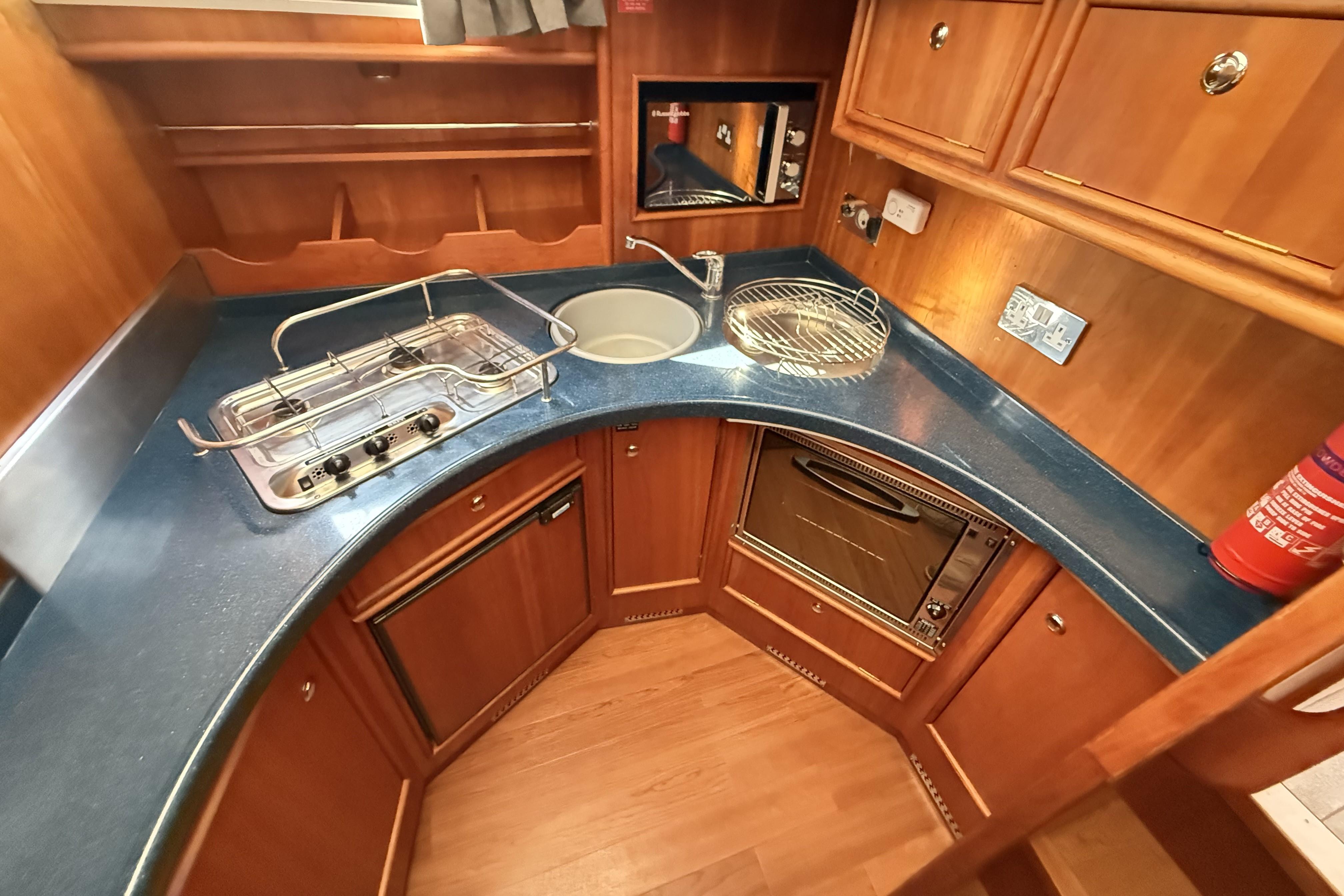 GALLEY to starboard - Avonite work surface, 3-burner gas hob, oven and grill, Russell Hobbs microwave, plenty of storage cupboards, twin sinks with mixer tap, high level shelves, water tank gauge and upgraded lighting.