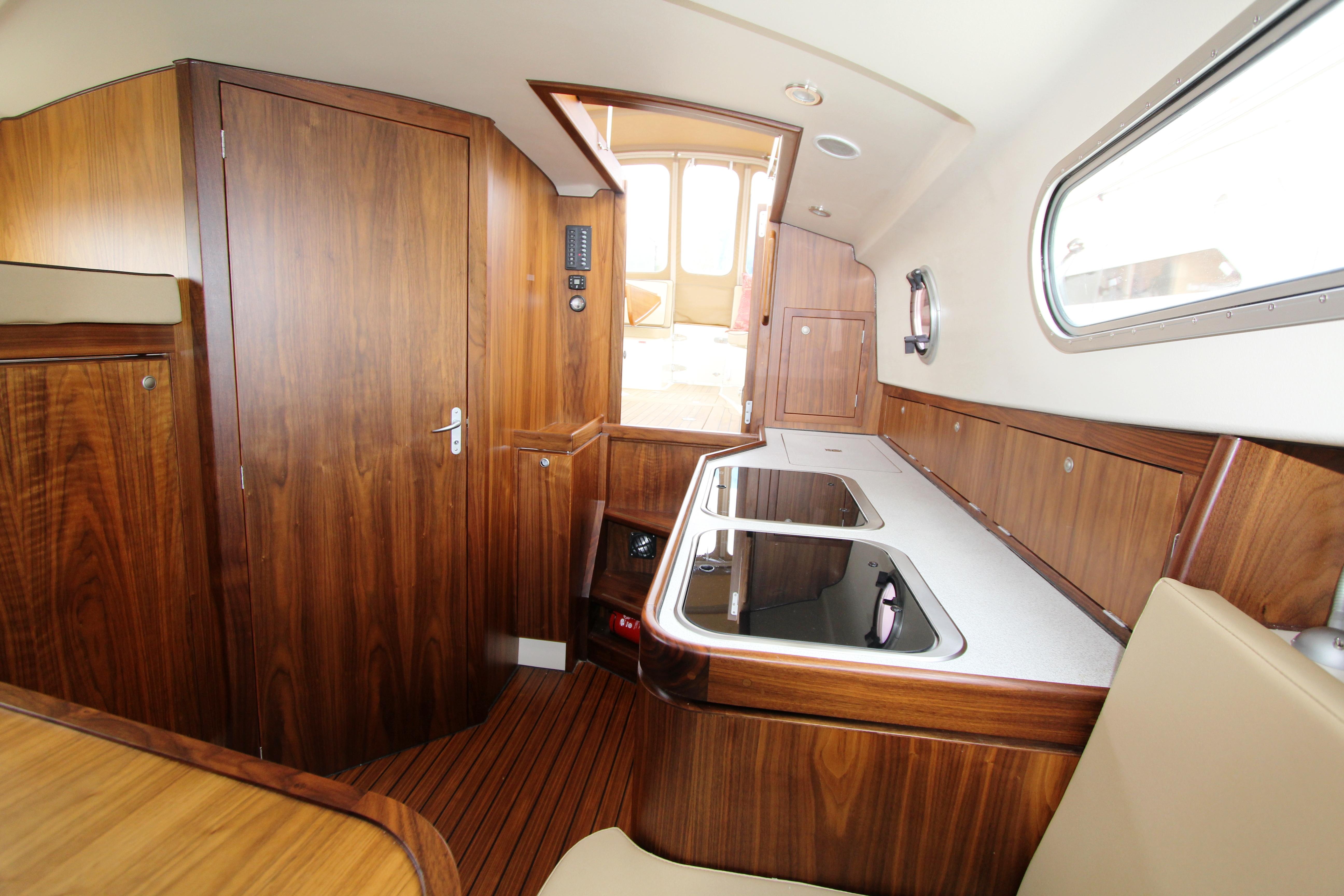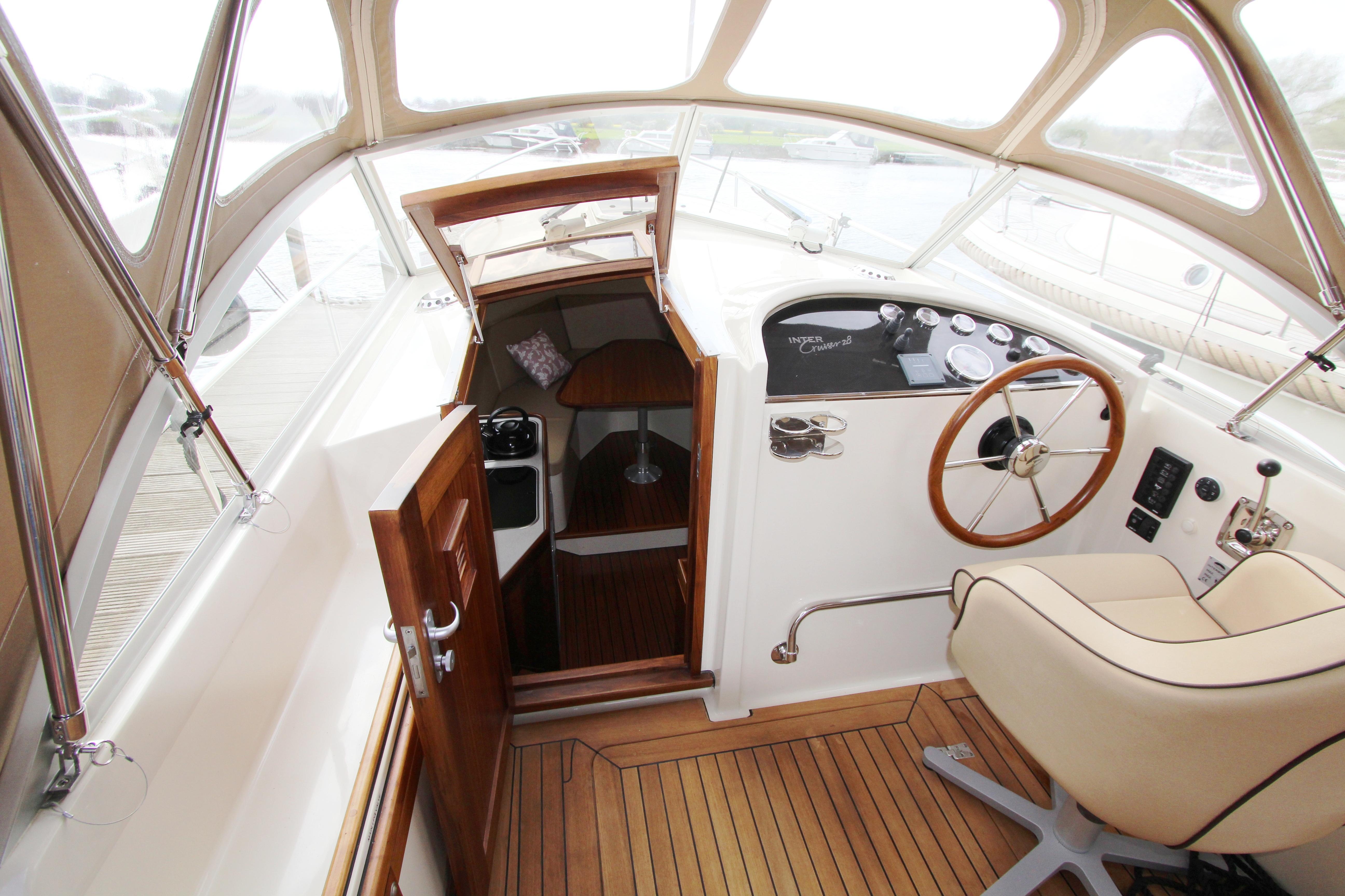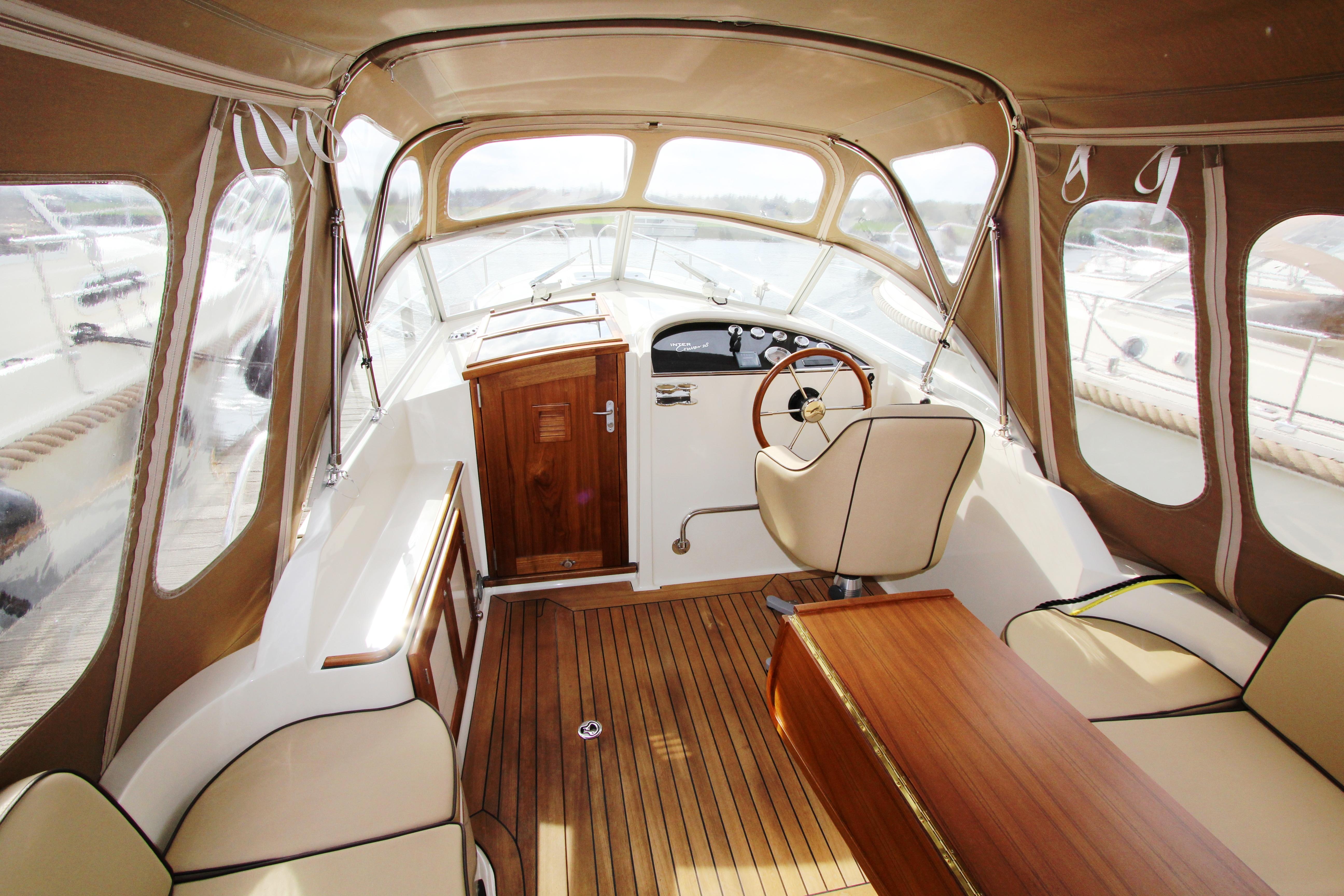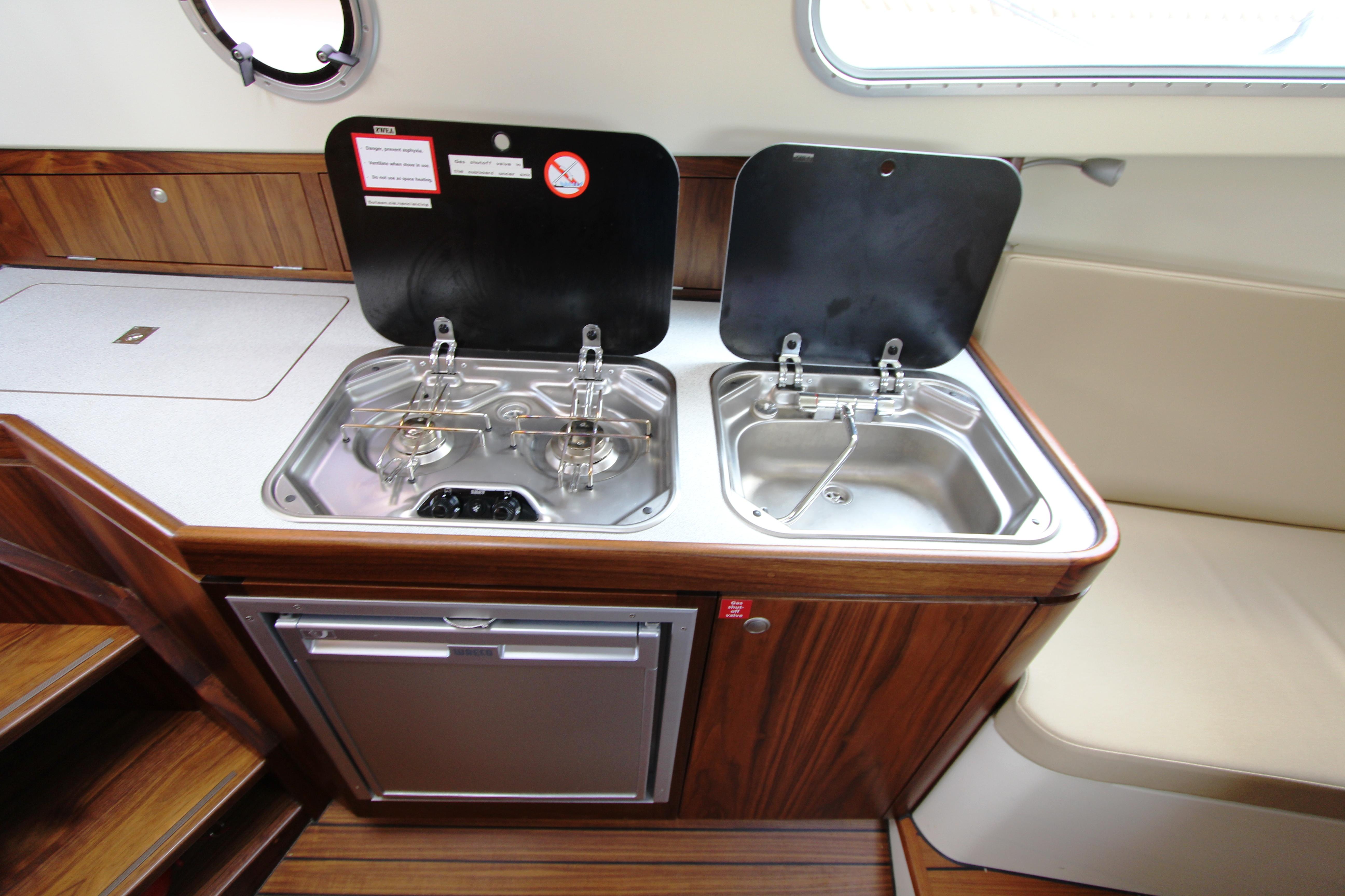Open plan cabin with table to the bow which drops to make a double berth and storage below. The galley is to the port with 12 v fridge, 2 burner hob and stainless sink, ample storage and work top space. The heads are to the stbd with manual pump toilet to holding tank. The cockpit has solid teak flooring, seating for up to six and two chairs at the helm position. Easy and good access to side decks and bathing platform is via the canopy and zipped sections.