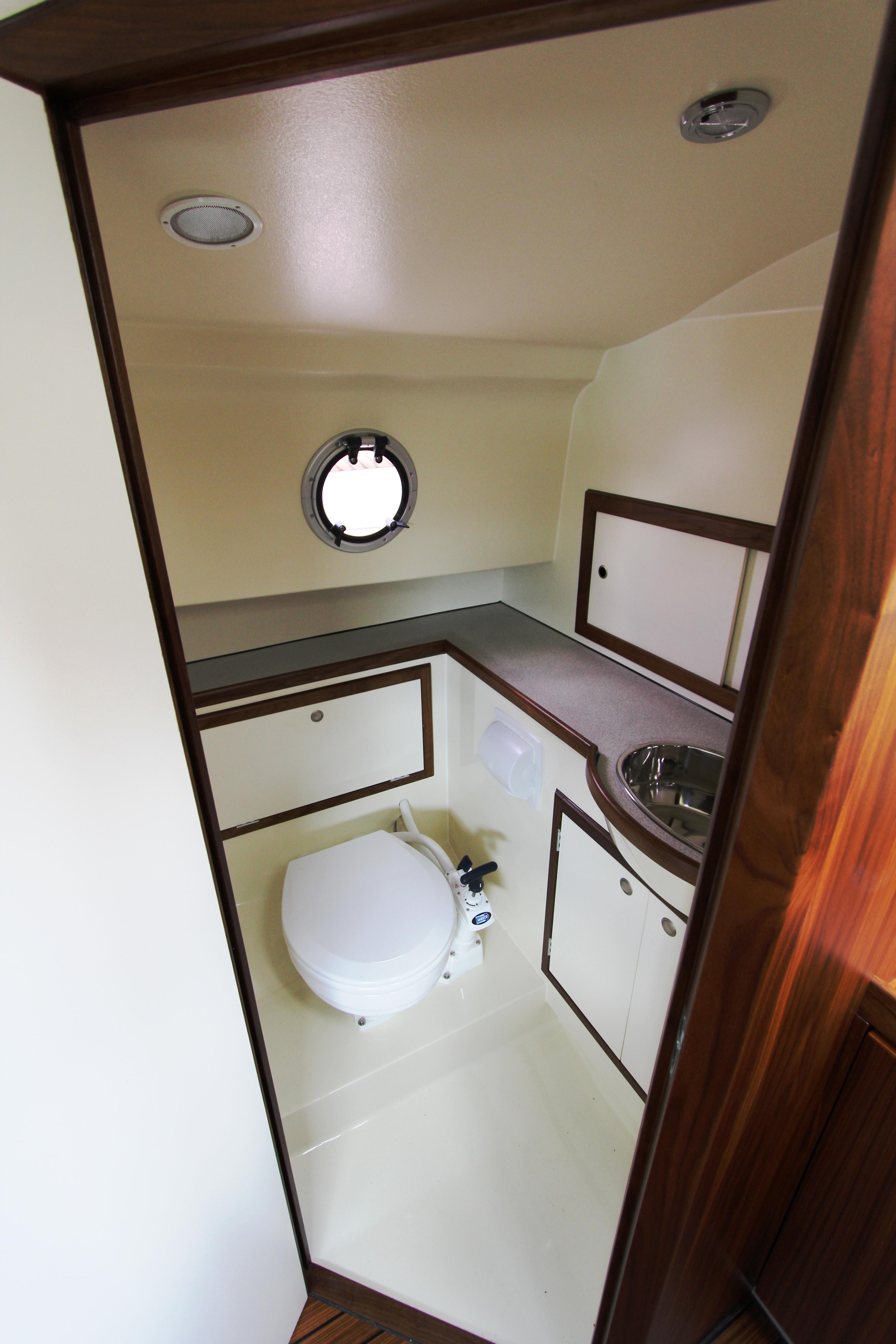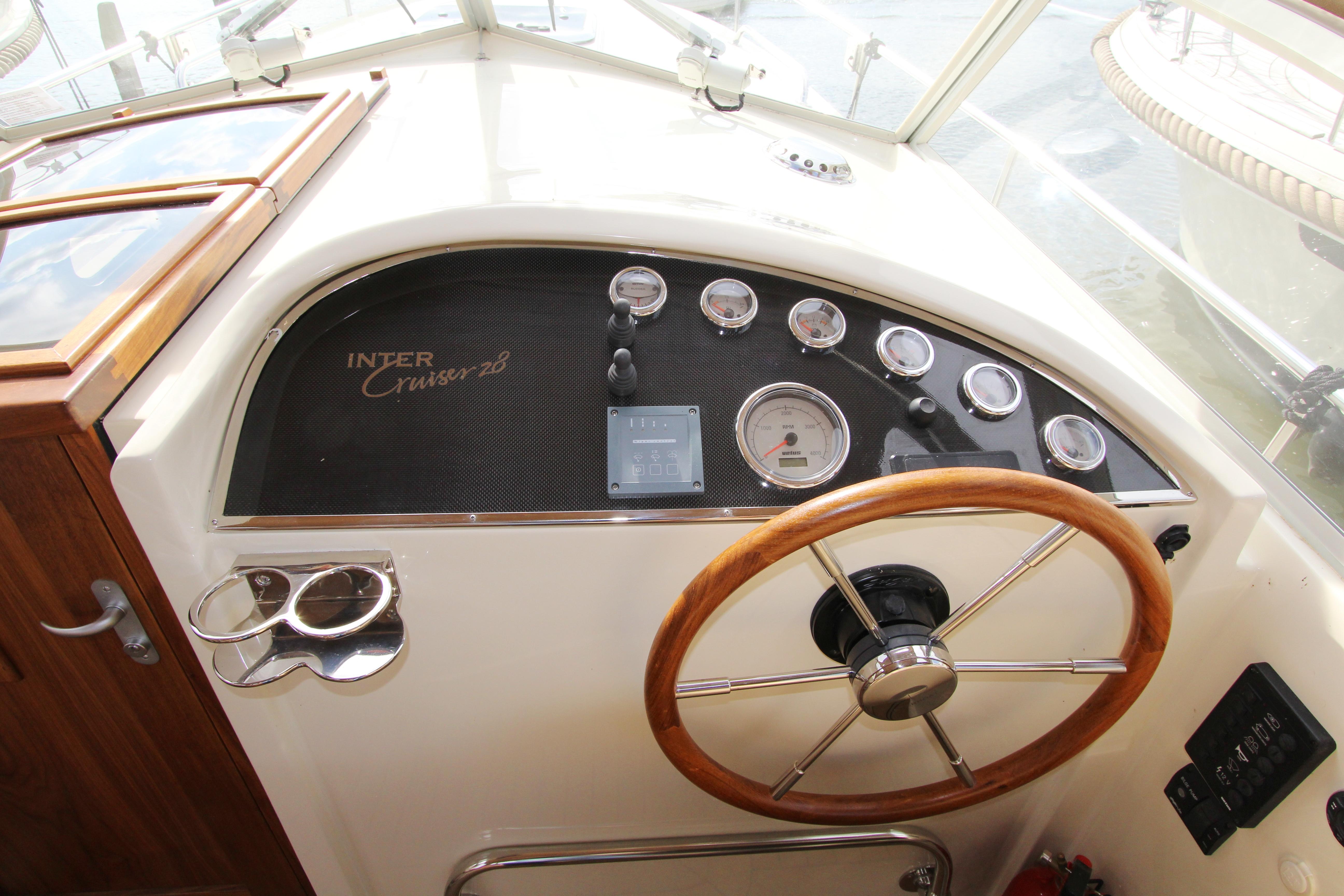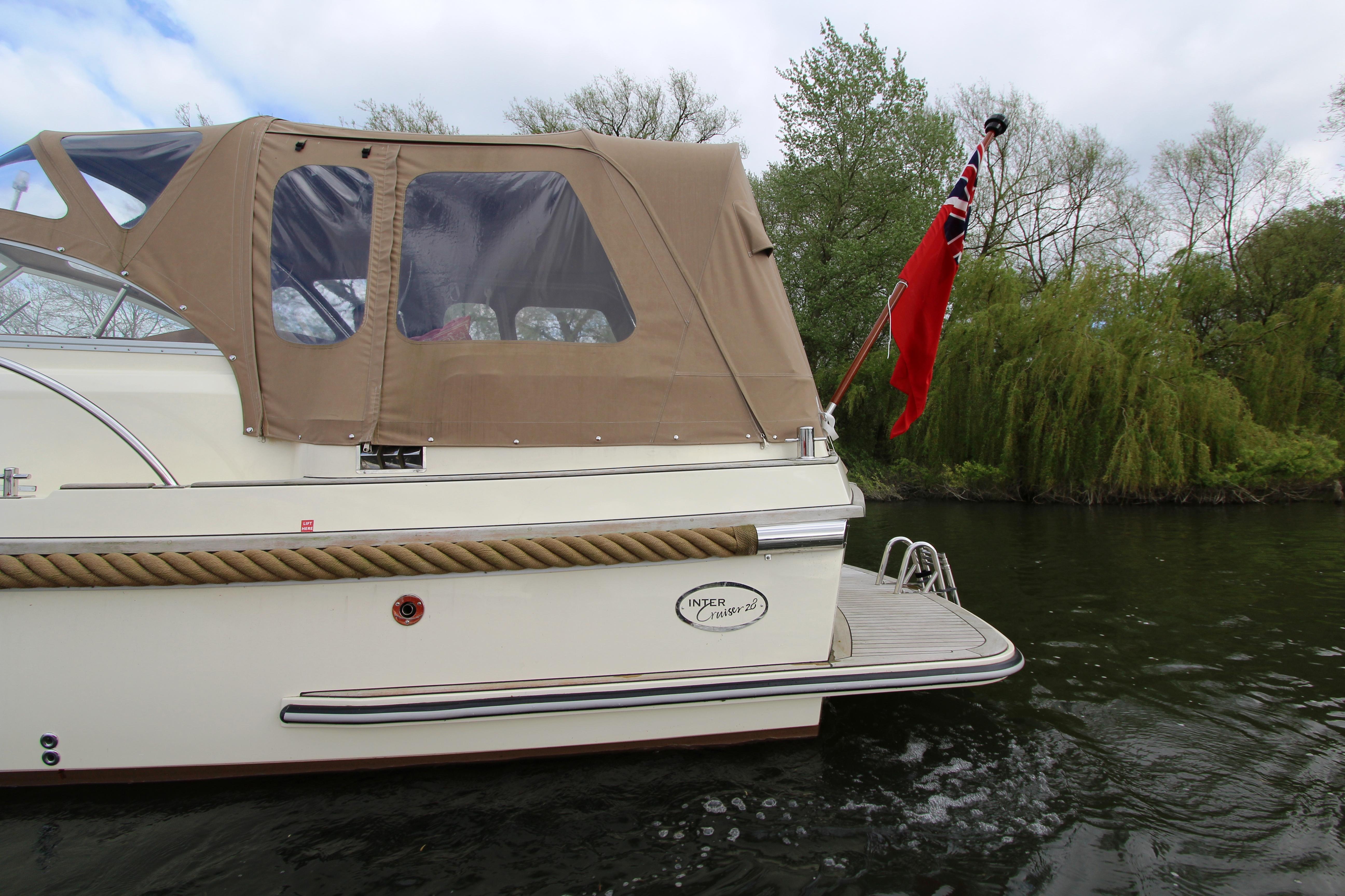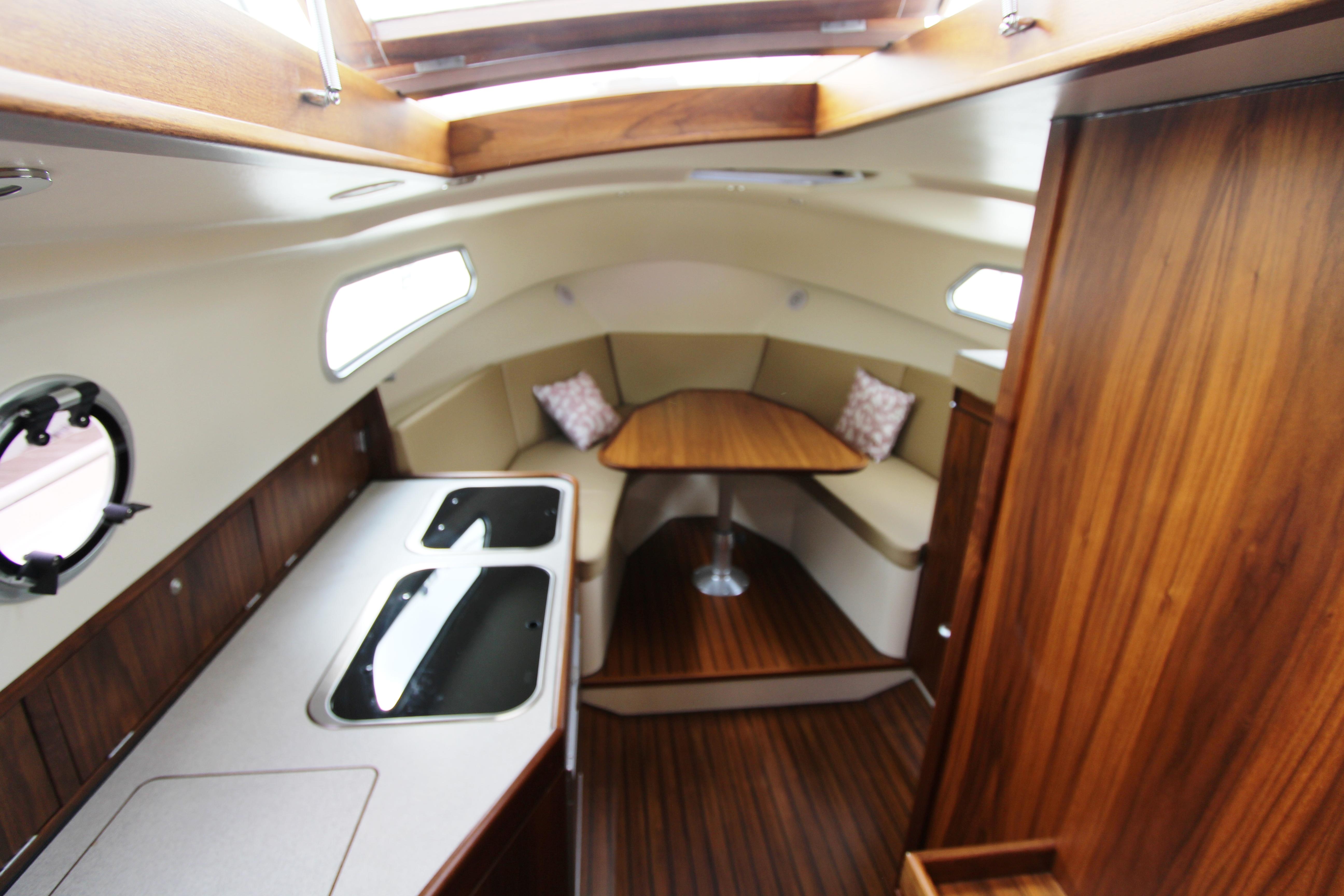 Open plan cabin with table to the bow which drops to make a double berth and storage below. The galley is to the port with 12 v fridge, 2 burner hob and stainless sink, ample storage and work top space. The heads are to the stbd with manual pump toilet to holding tank. The cockpit has solid teak flooring, seating for up to six and two chairs at the helm position. Easy and good access to side decks and bathing platform is via the canopy and zipped sections.
