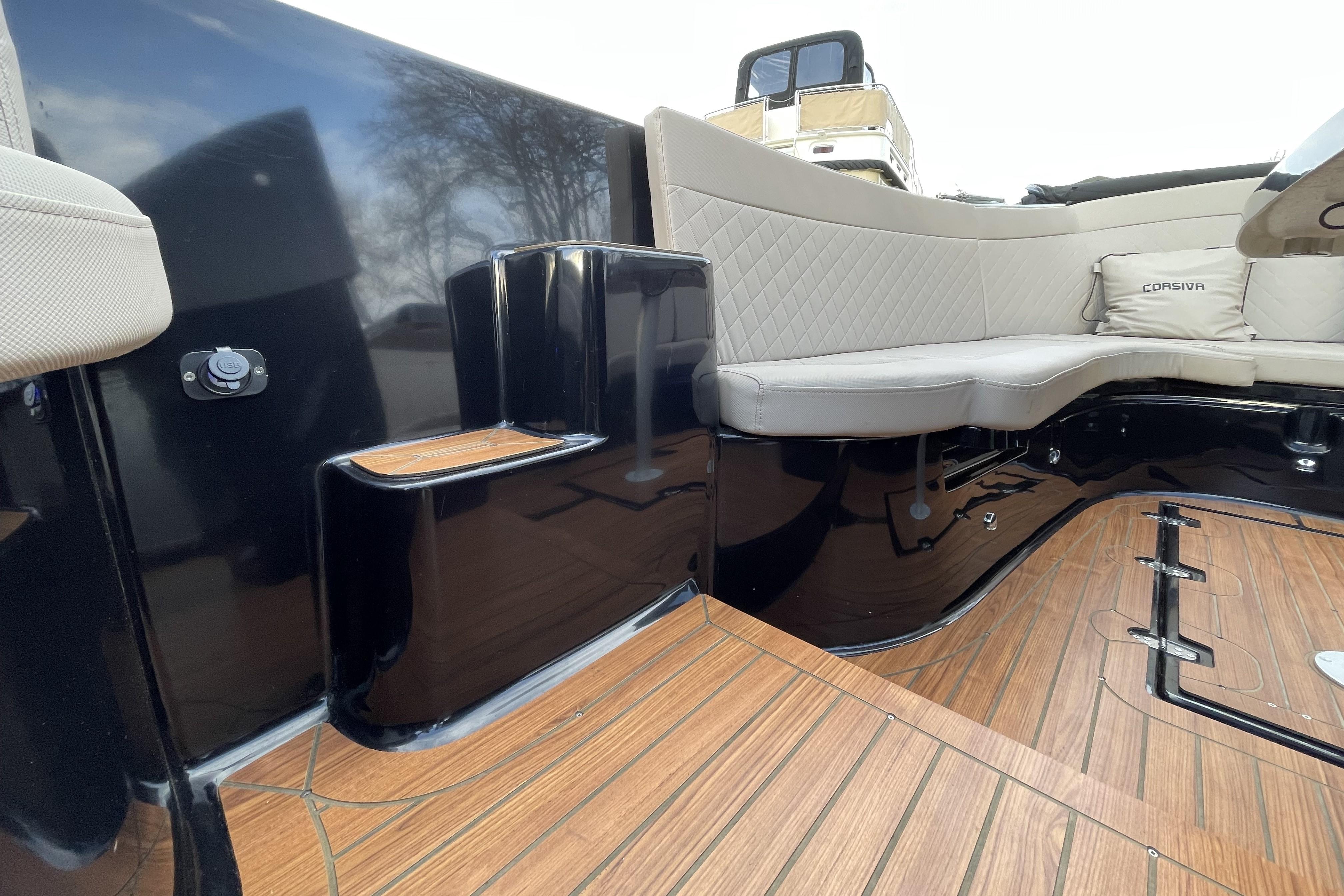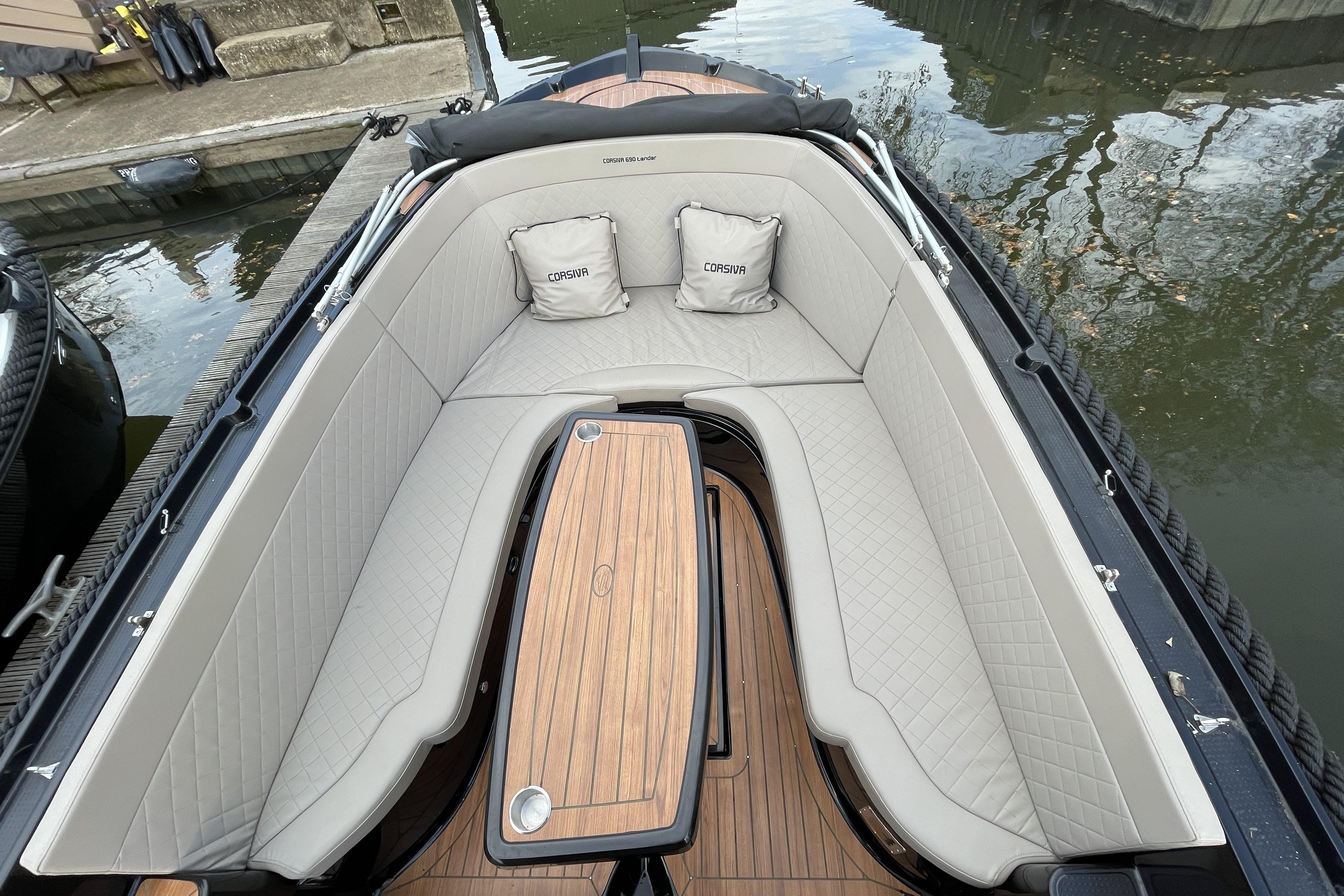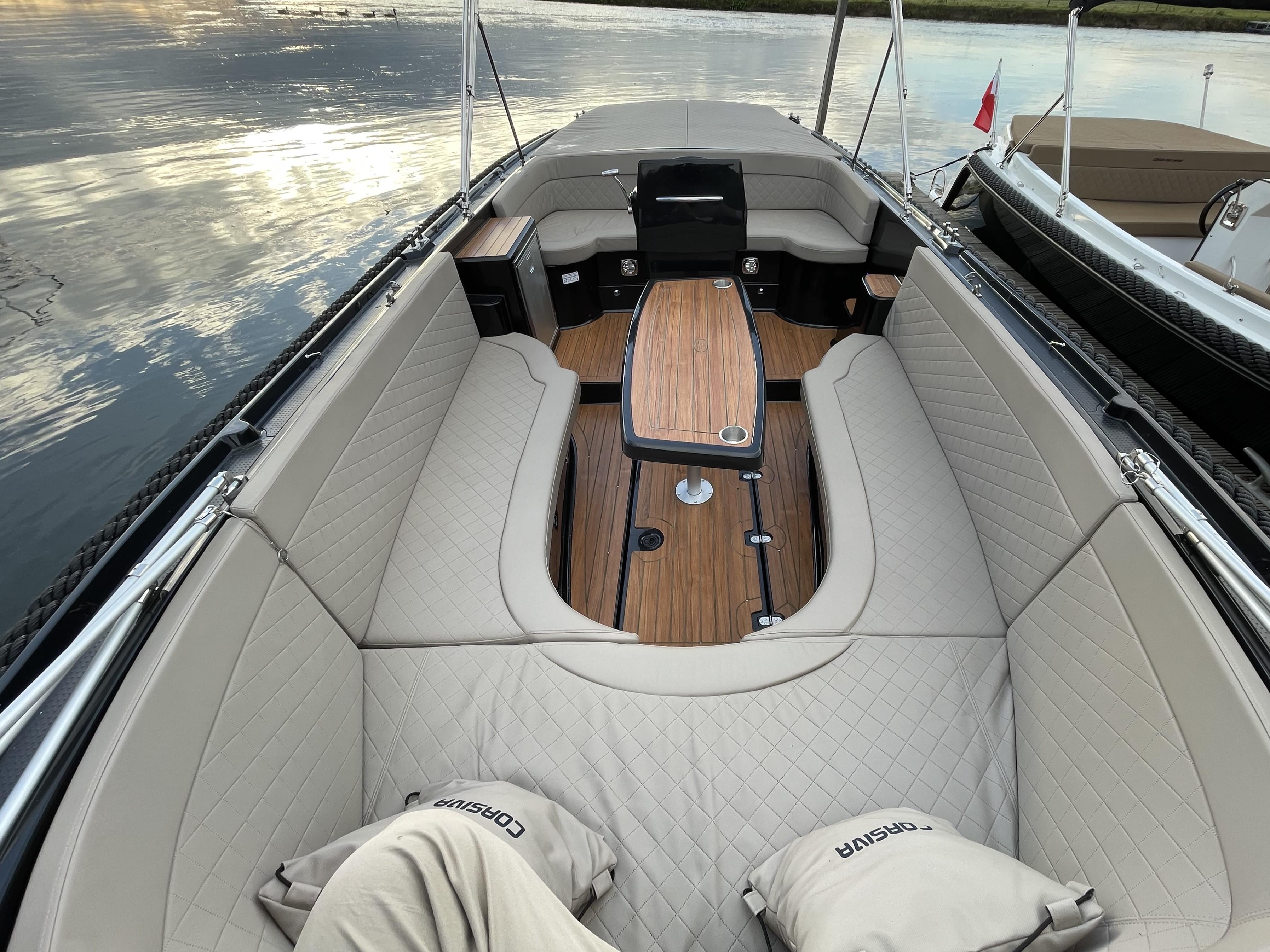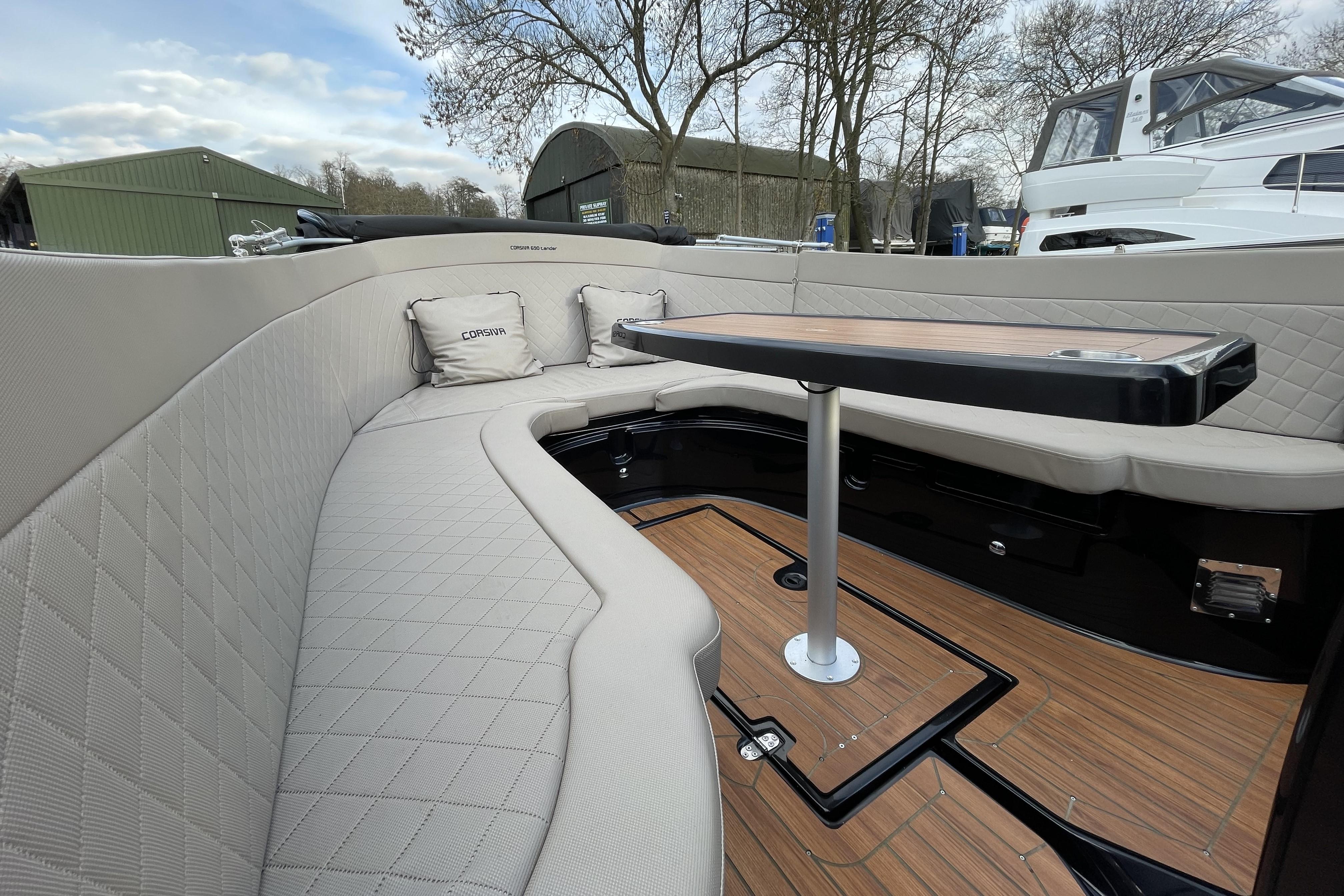 The Corsiva 690 benefits from a large cockpit, seating 9 in comfort. She has storage below all seats, there is also storage below the forward floor. The centre helm position allows you to move around her seamlessly. The cockpit has been fitted with teak effect flooring, low level lights, upgraded Diamante cushions (quilted) and a central table which is removeable.