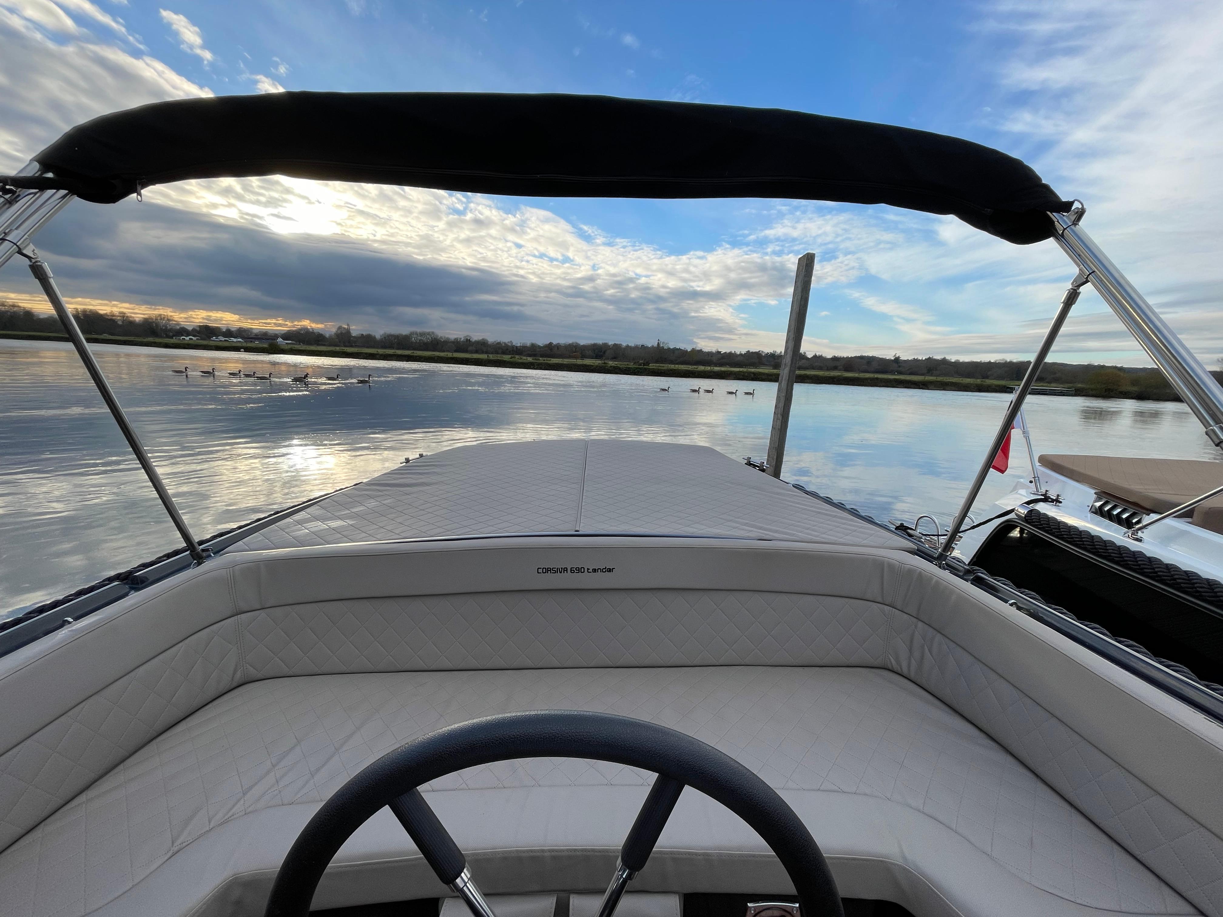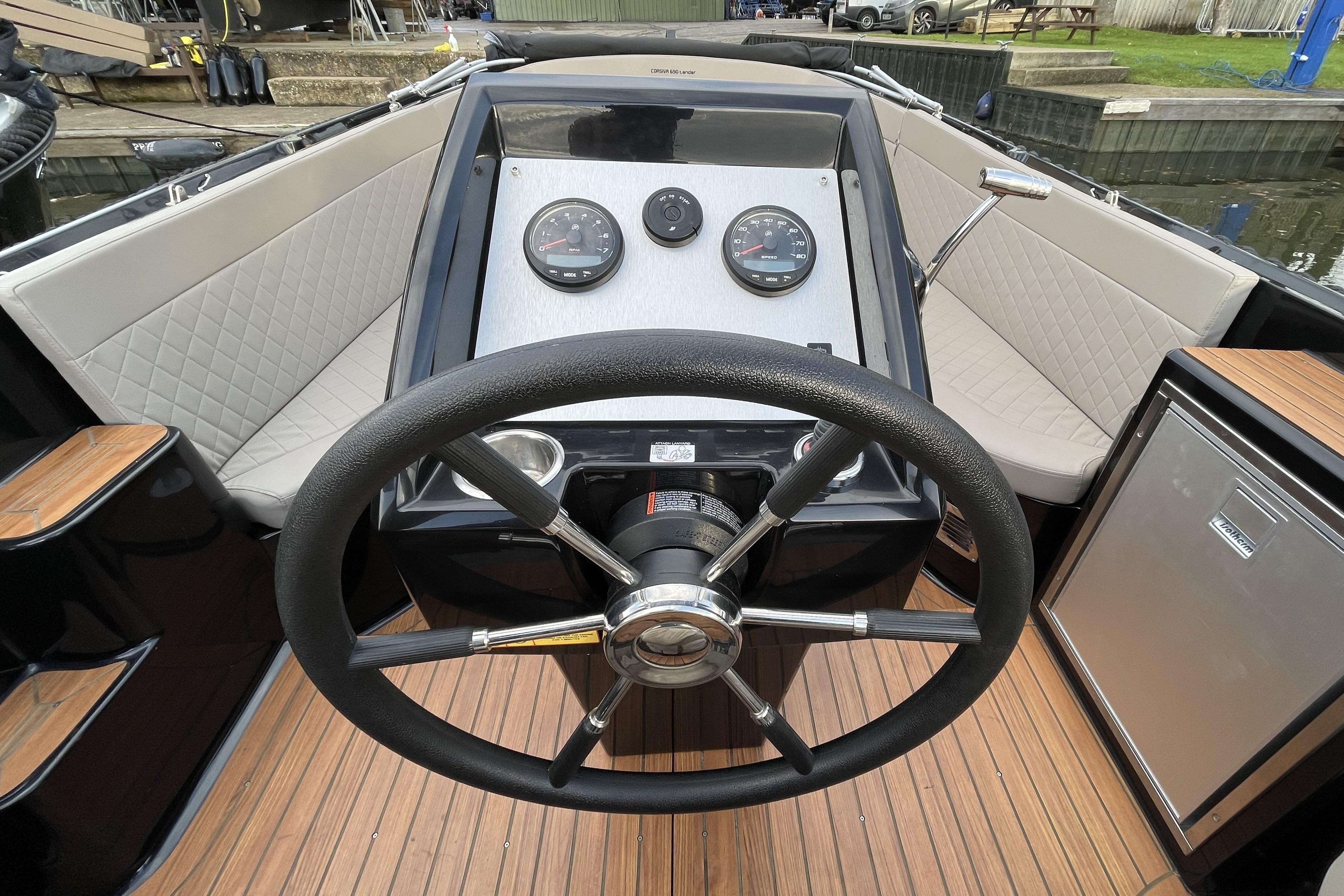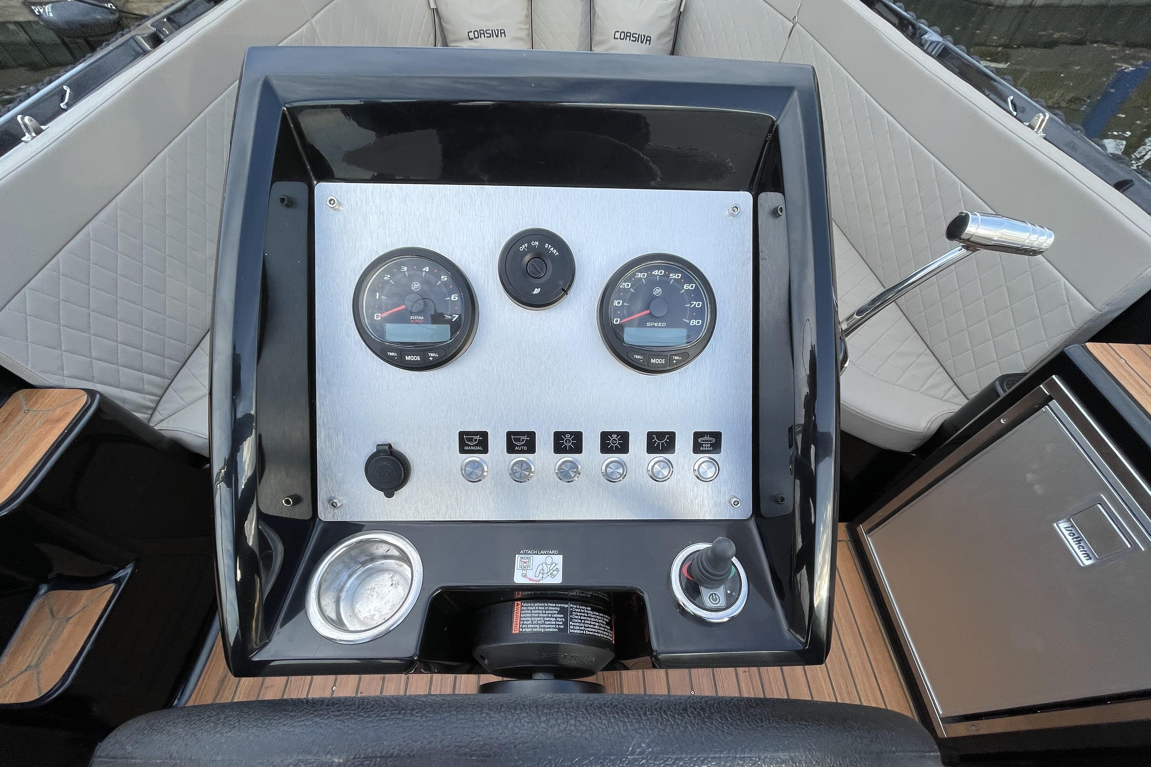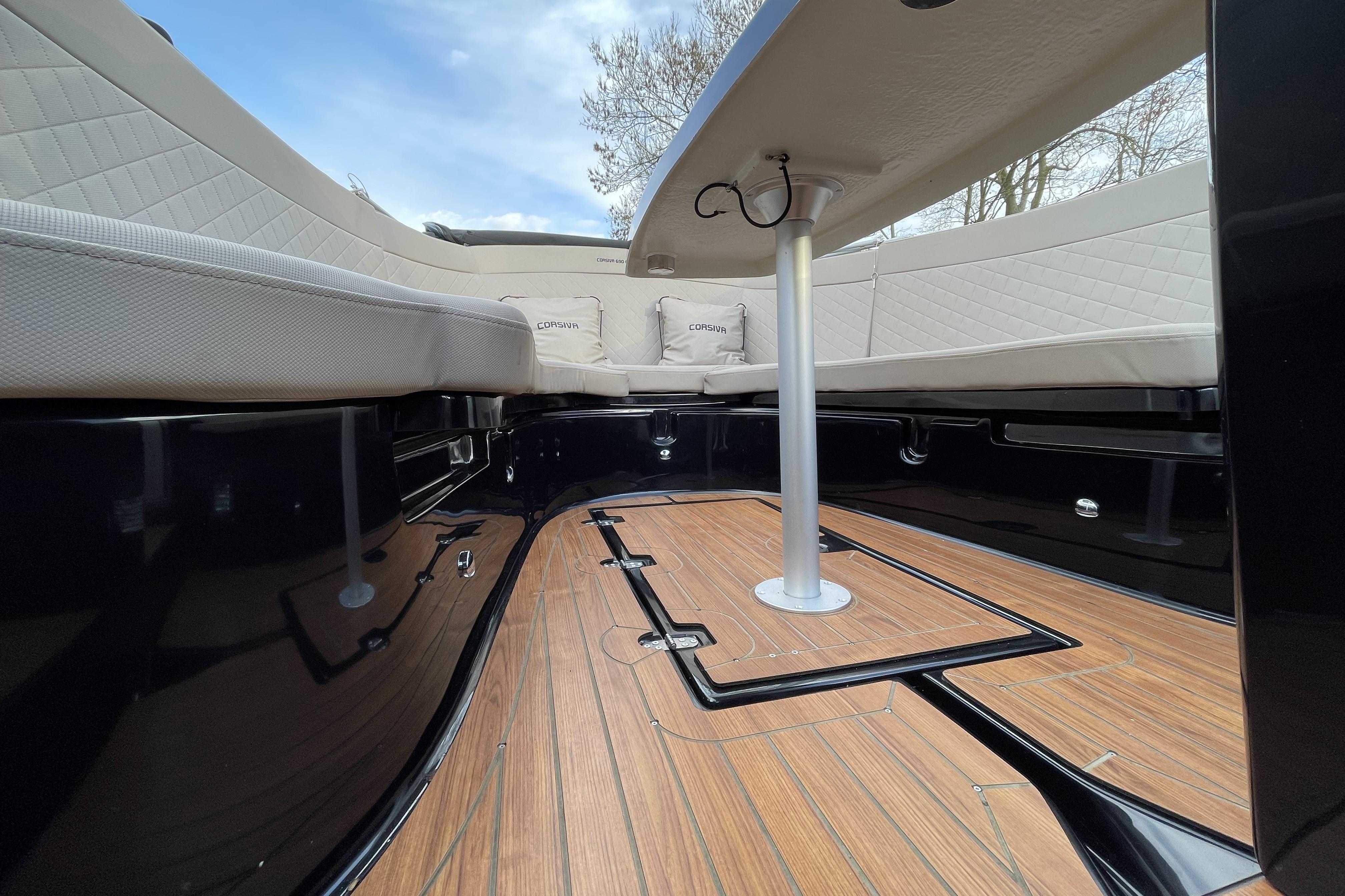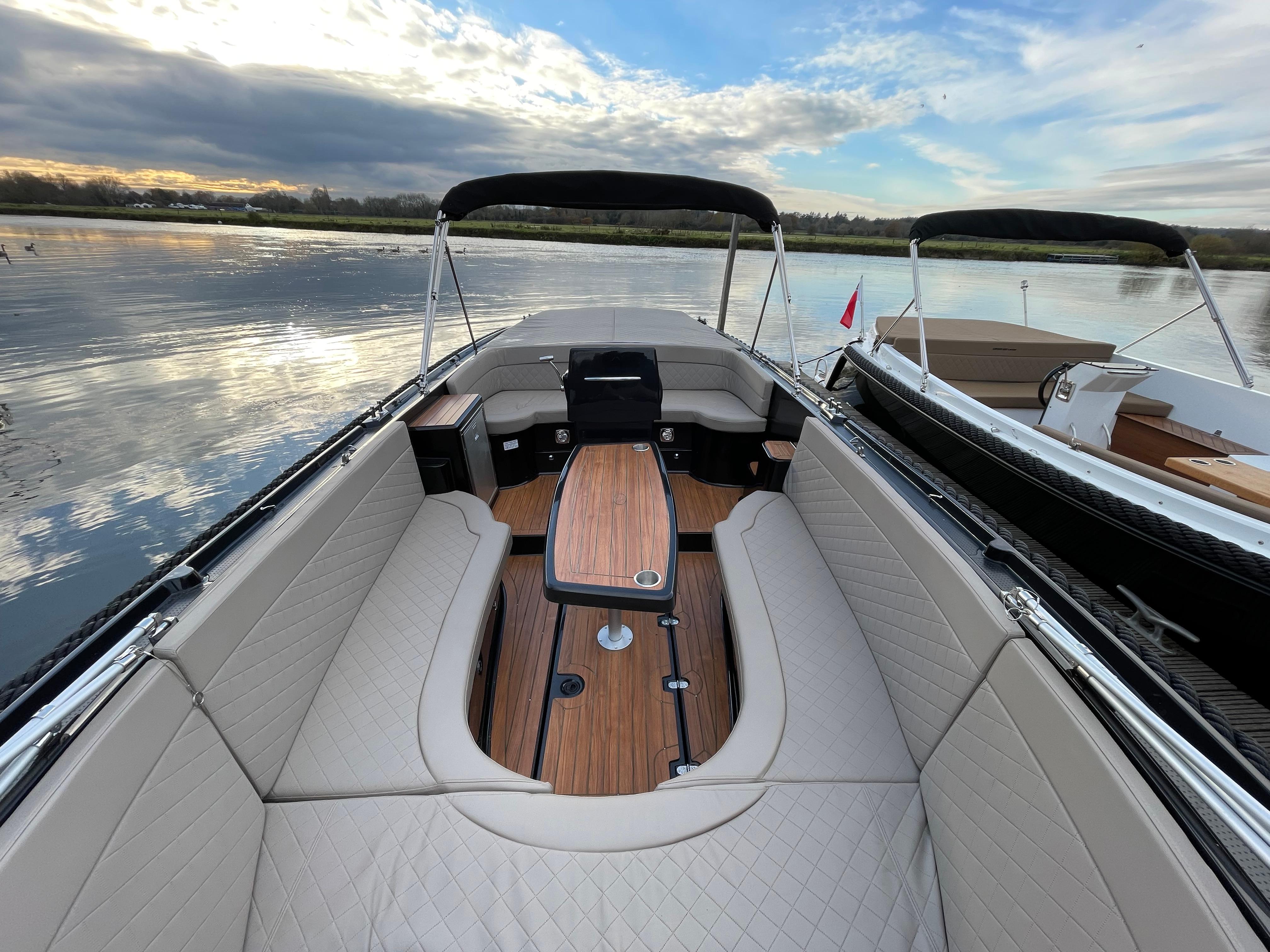 The Corsiva 690 benefits from a large cockpit, seating 9 in comfort. She has storage below all seats, there is also storage below the forward floor. The centre helm position allows you to move around her seamlessly. The cockpit has been fitted with teak effect flooring, low level lights, upgraded Diamante cushions (quilted) and a central table which is removeable.