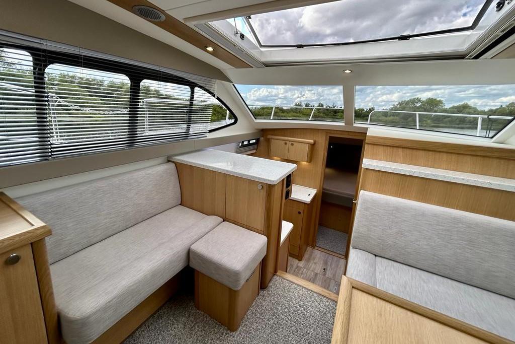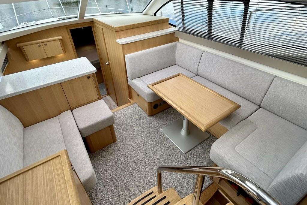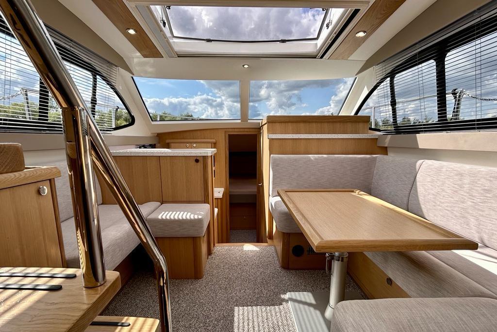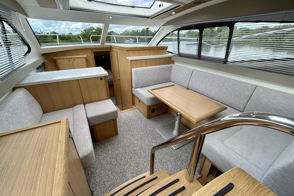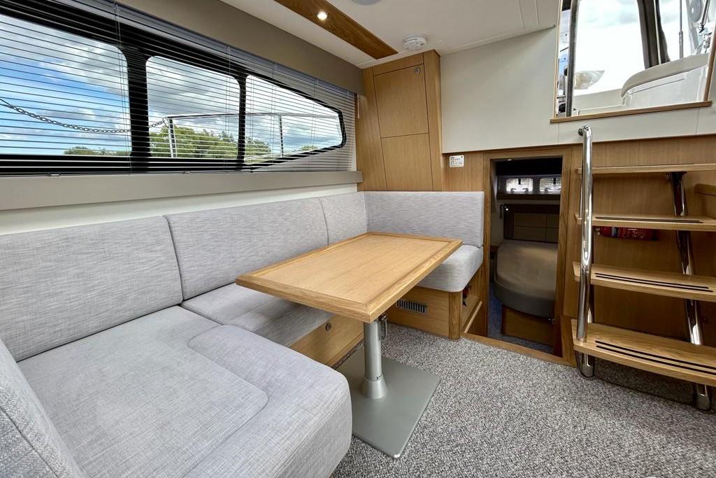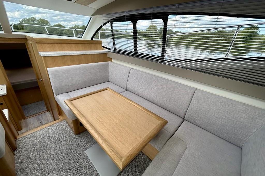 Saloon - Portside cupboard with drawer / cocktail cabinet and a freestanding settee with storage under forward. Hardwood / stainless steel stairs to aft deck. U-shaped settee to starboard, converting to double with storage under, and a large rectangular table. Electrics panel in aft corner in eye-level cupboard.