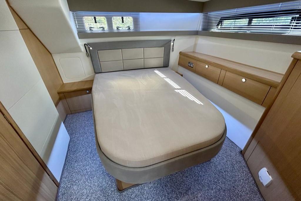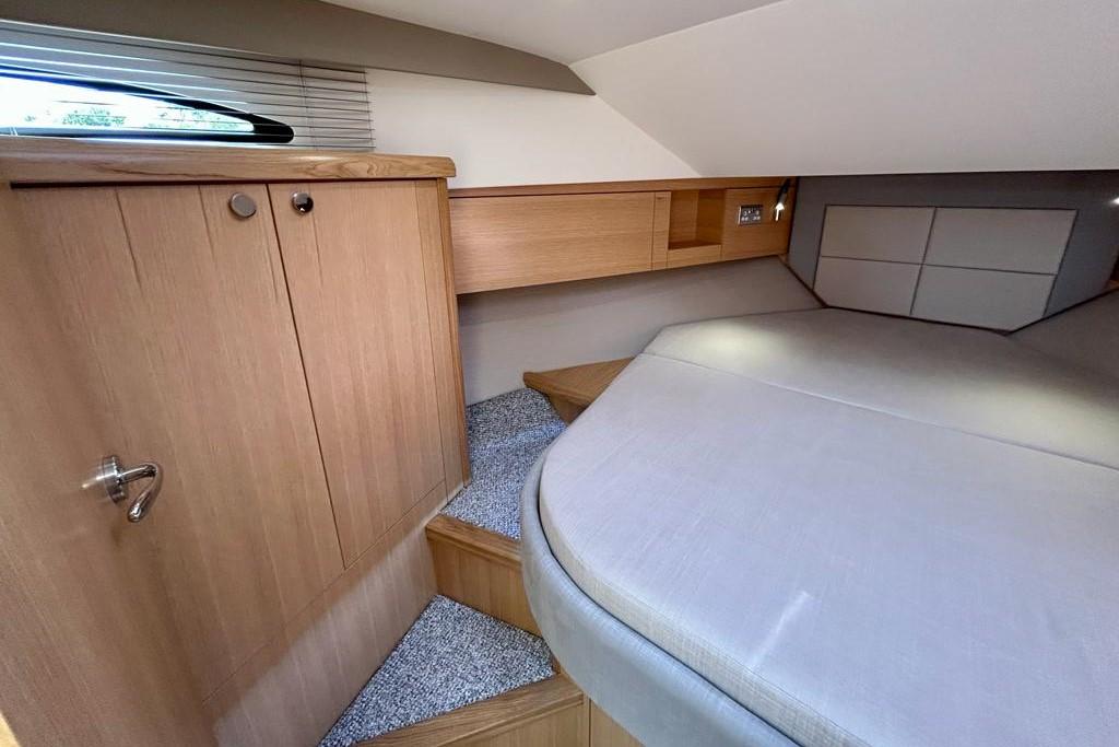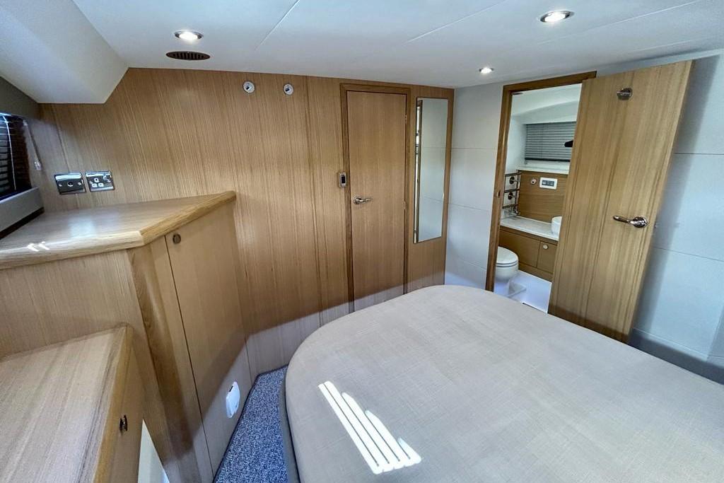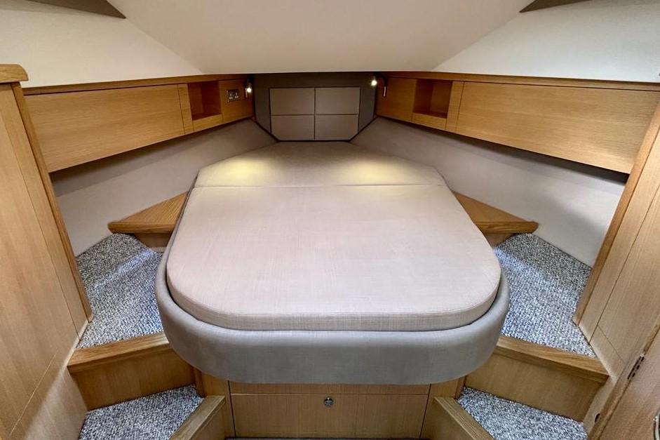 Forward cabin - Island berth double with storage under (option of V-berths), large hanging locker, bedside cabinets and shelves around berths.