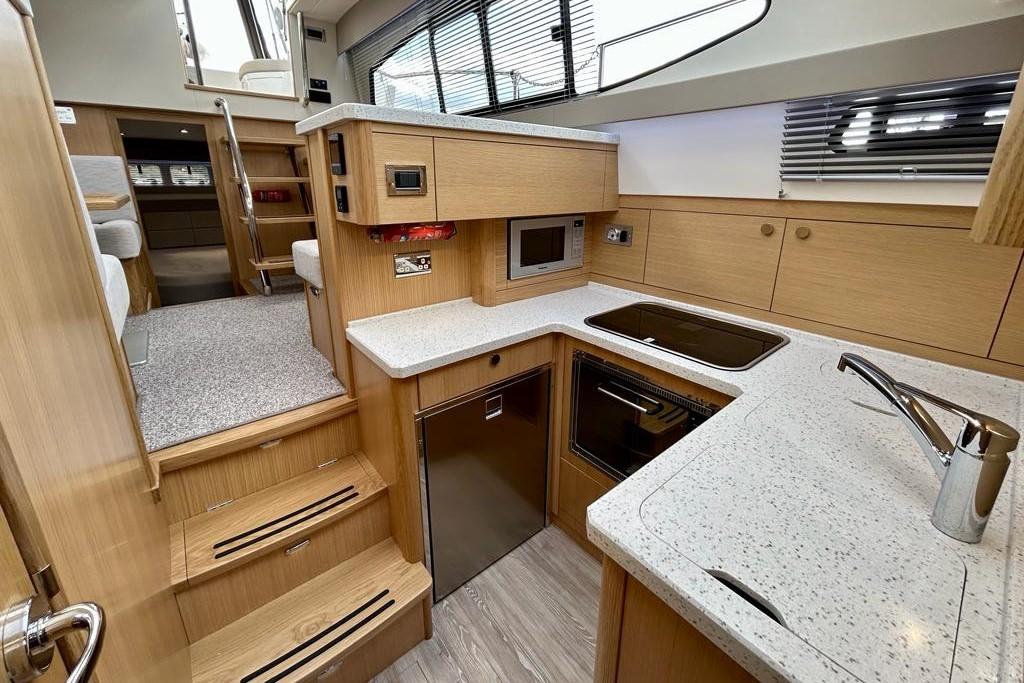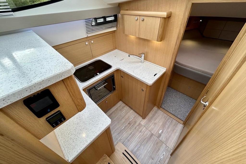 Galley - To port with large Avonite work surface, 130 litre stainless steel fridge, 3 burner gas hob, oven and grill, 2 square sinks with mixer tap, large cupboard under sink, eye-level locker to aft bulkhead, outboard cupboard with crockery storage, eye-level shelf to forward bulkhead and a divided cutlery drawer above the fridge.