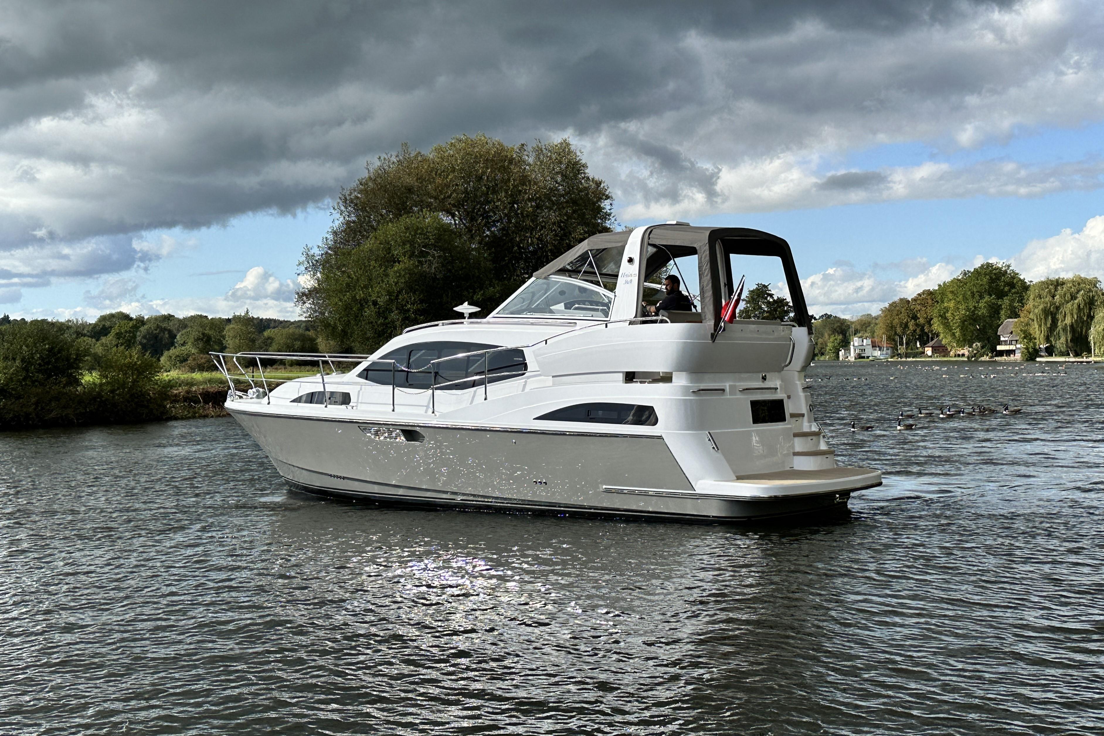 Aft Deck - Helm to starboard with double helm seat, dash with full engine instruments, chart table, easy lift forward canopy, aft canopy easily lowered, 4 x deck storage lockers with cushions, gas locker, helm seat with forward / aft facing backrest, and a large opening teak table. Pullpit rails with dodgers, steps to large easy access bathing platform and swim ladder.