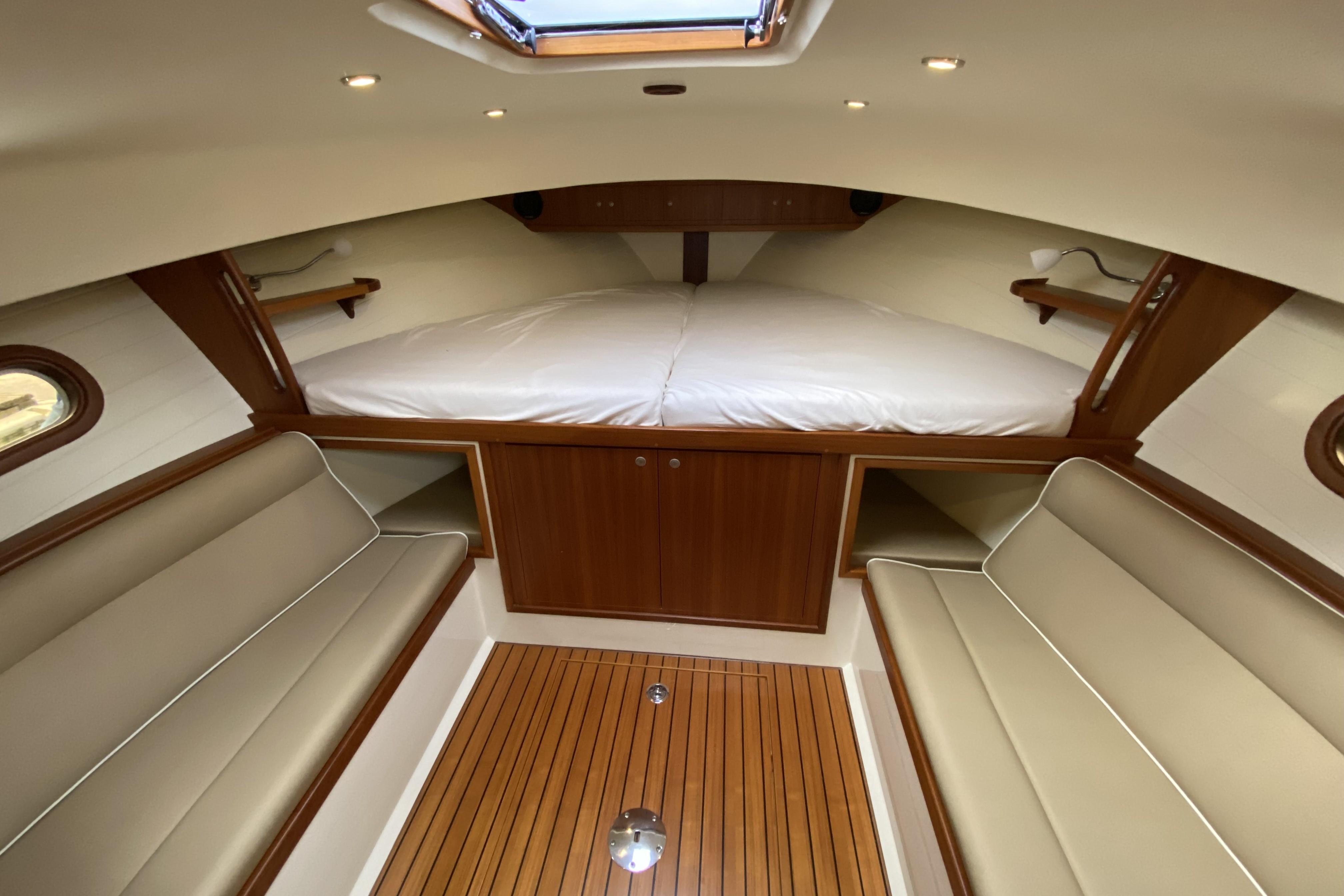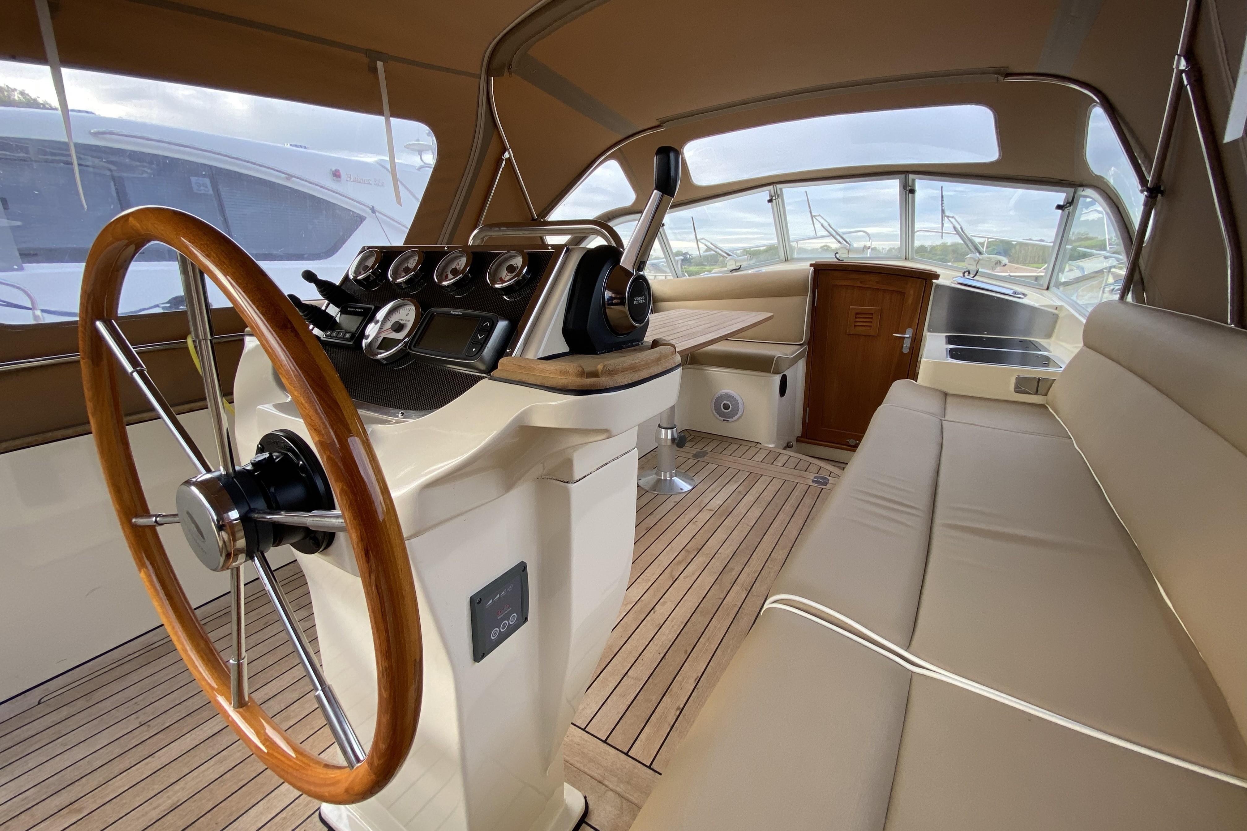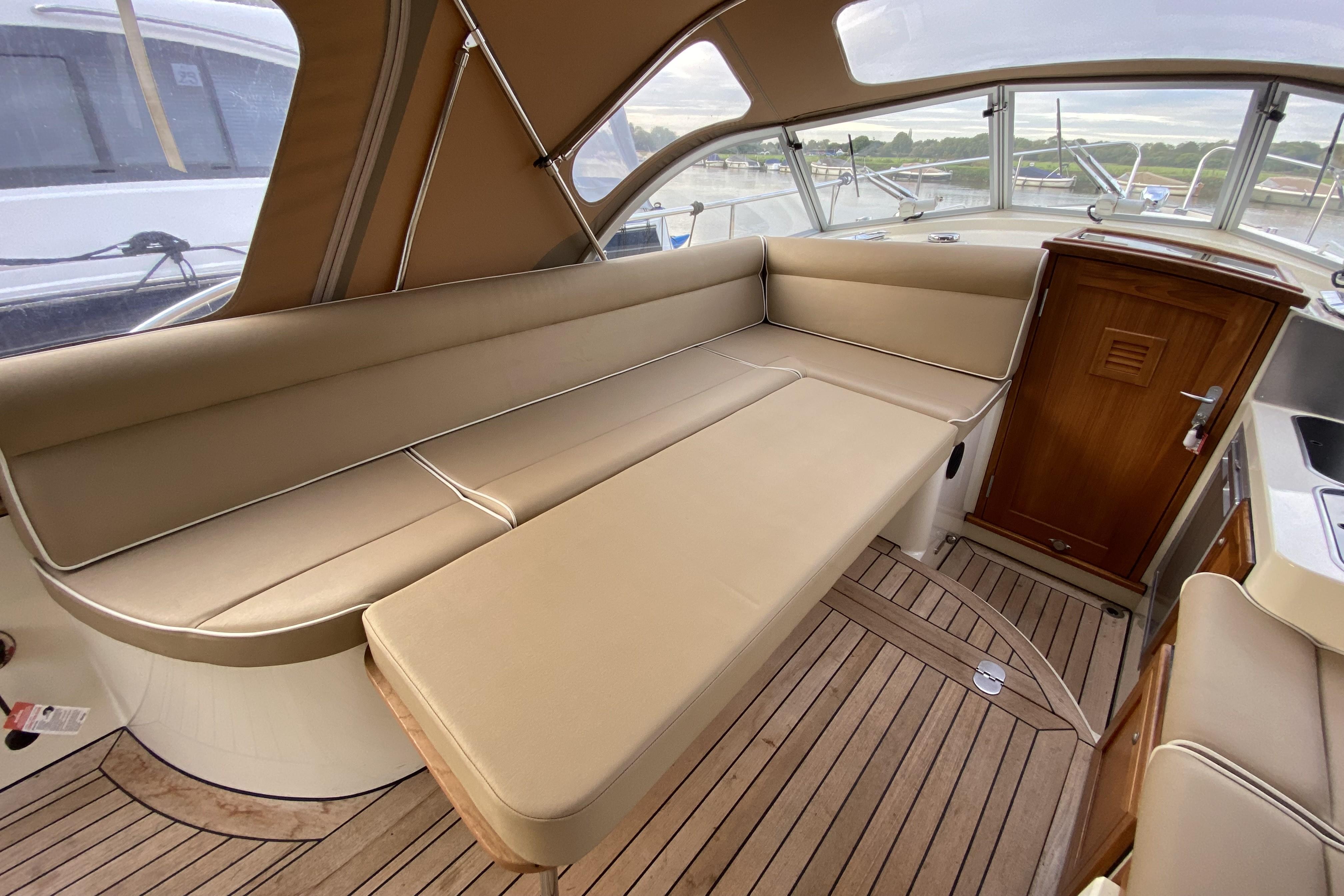 Deck / structure - Spacious self-draining cockpit with two L-shaped benches one to port and one to starboard, both with storage under. Freestanding steering column with instruments. Comfort cushion set with back cushions and piping, port bench in cockpit converts to a sun bed or can feature as a 5/6th berth.