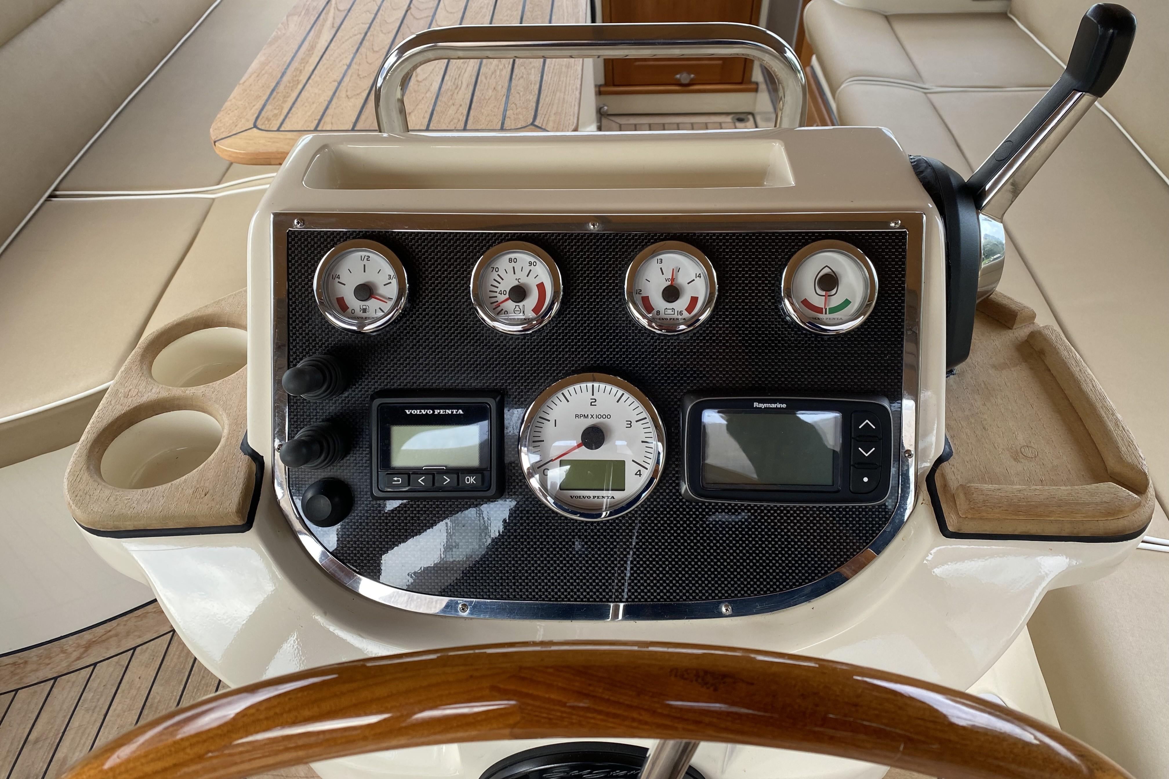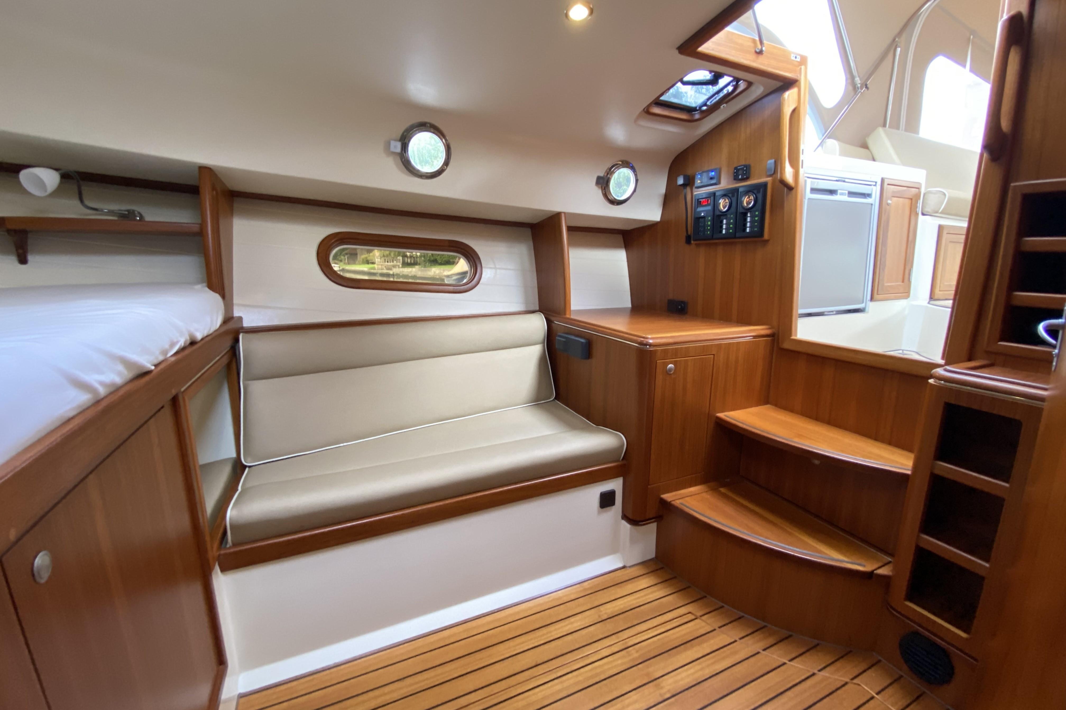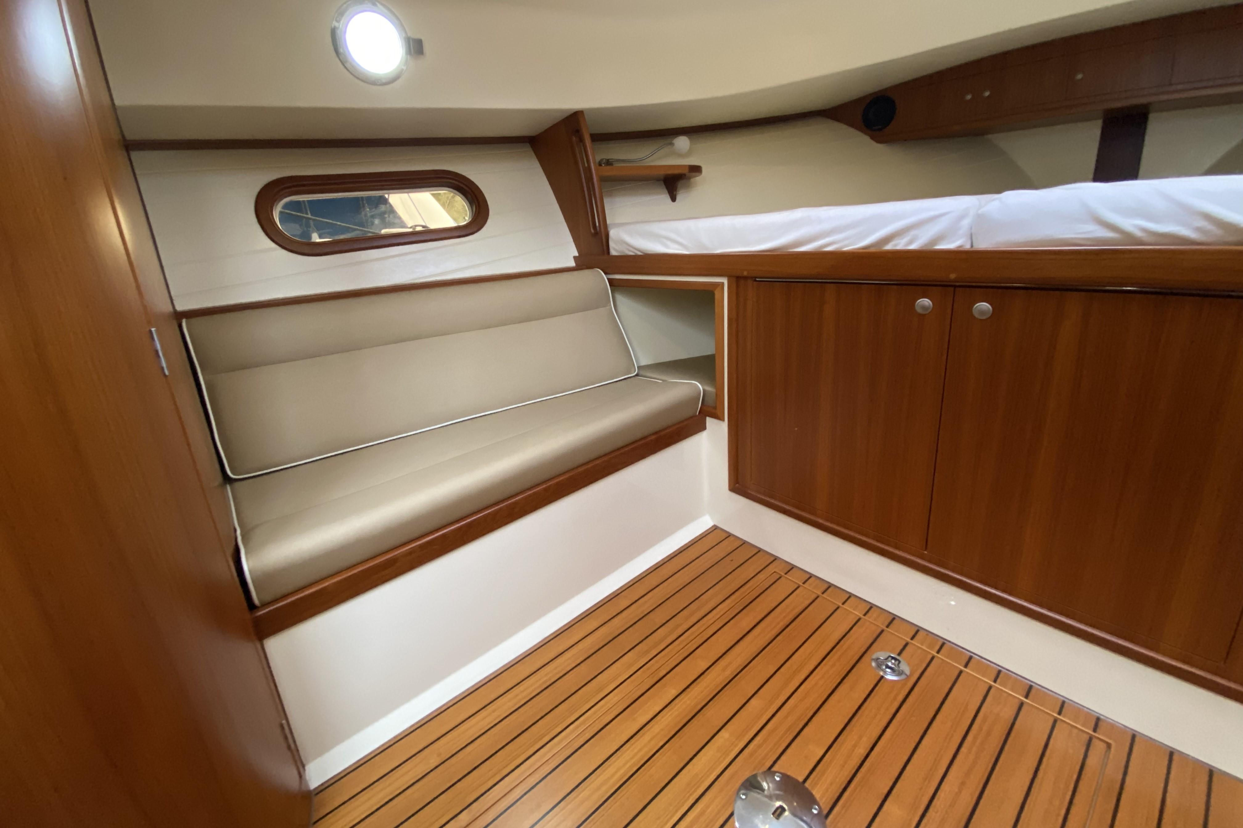 Deck / structure - Spacious self-draining cockpit with two L-shaped benches one to port and one to starboard, both with storage under. Freestanding steering column with instruments. Comfort cushion set with back cushions and piping, port bench in cockpit converts to a sun bed or can feature as a 5/6th berth.