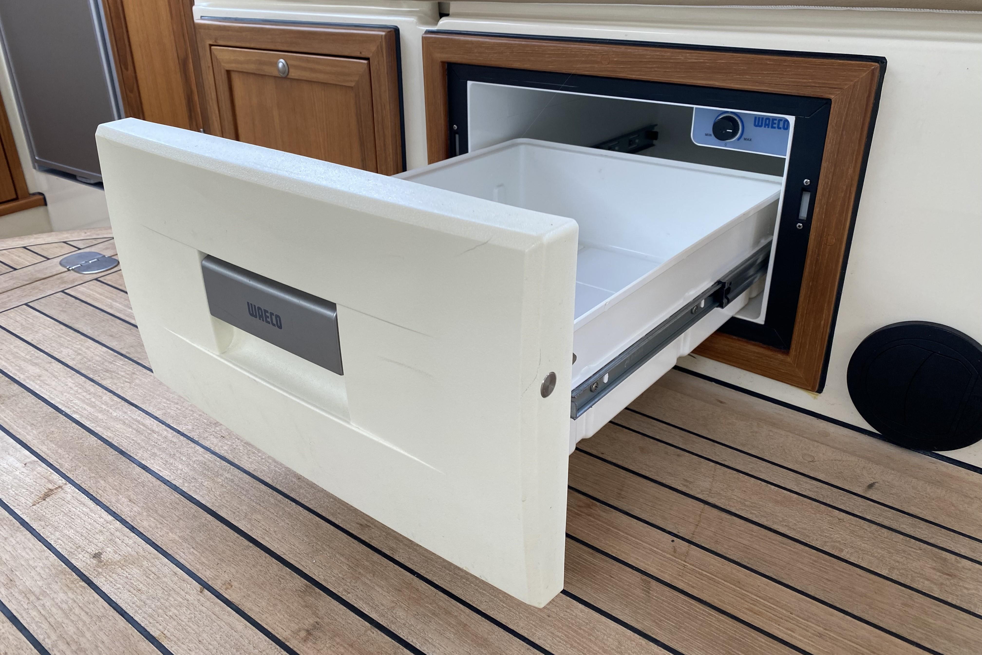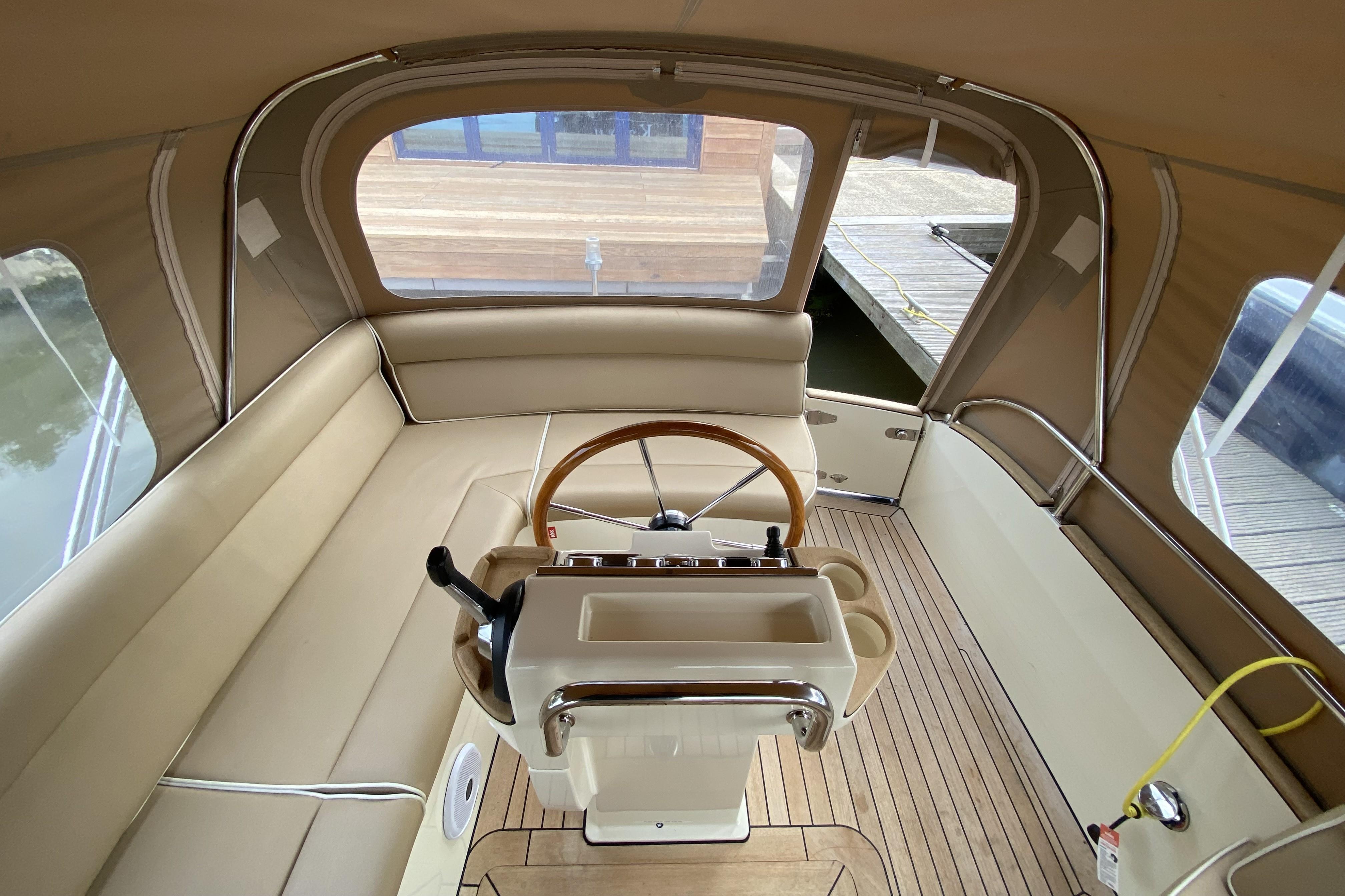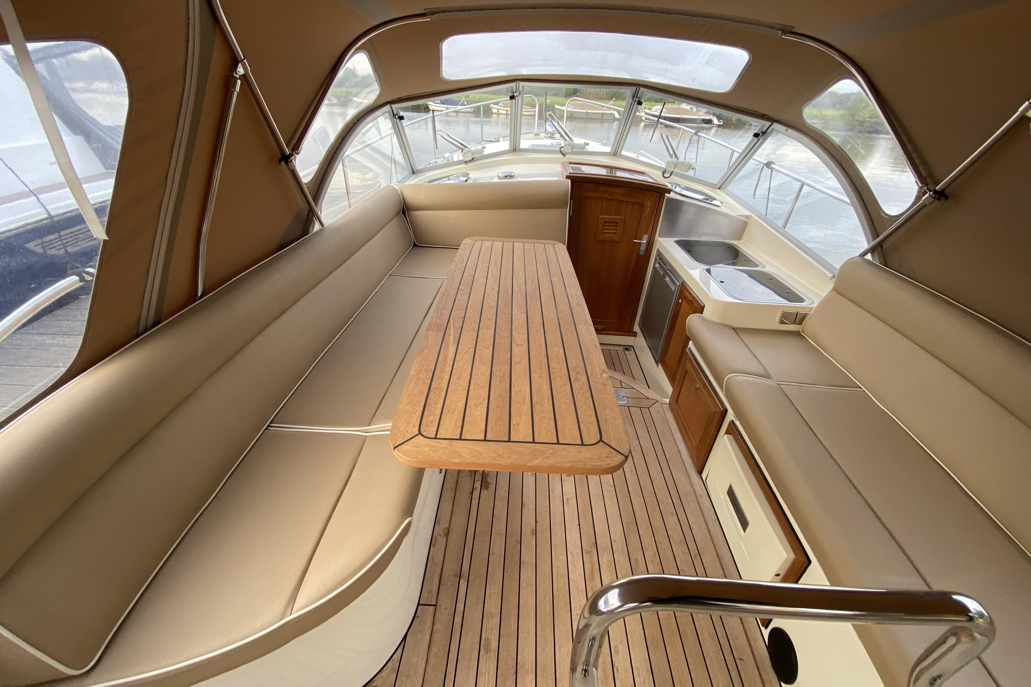 Cockpit - One of the main features of this boat, the teak floored cockpit gives an unrivalled social space with comfortable seating on boat sides and a aft helm position. There is access to the open galley, and through transom door to bathing platform. With use of the optional larger teak table, the port side seating converts to a large sun lounger or occasional double berth. A smaller teak table is also included which is interchangeable between the cabin and cockpit.