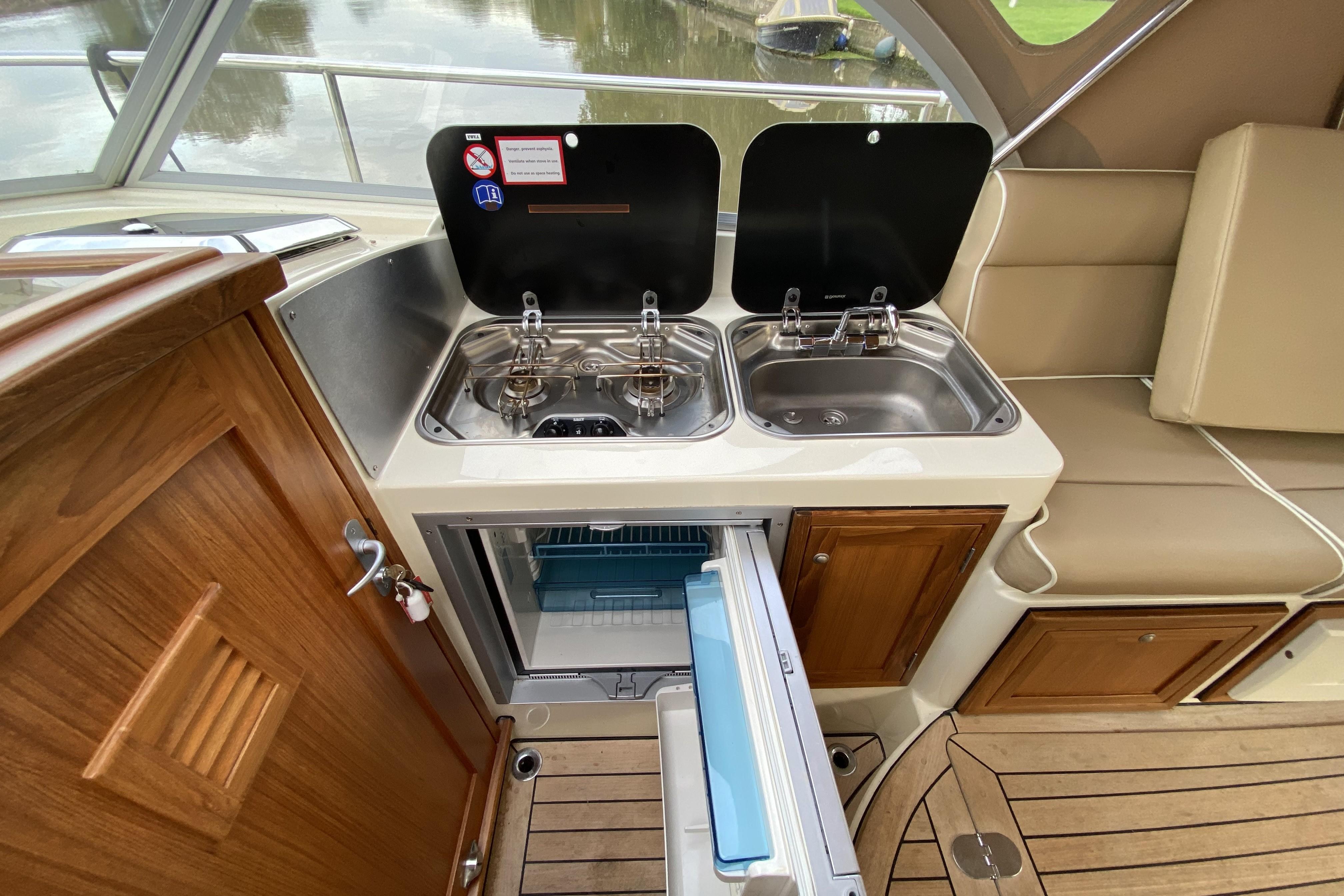 Galley - Features 65 litre refrigerator, twin burner gas cooker, stainless steel wash basin, mixer taps with hot and cold running water, pressure water system with 30 litre immersion boiler.
