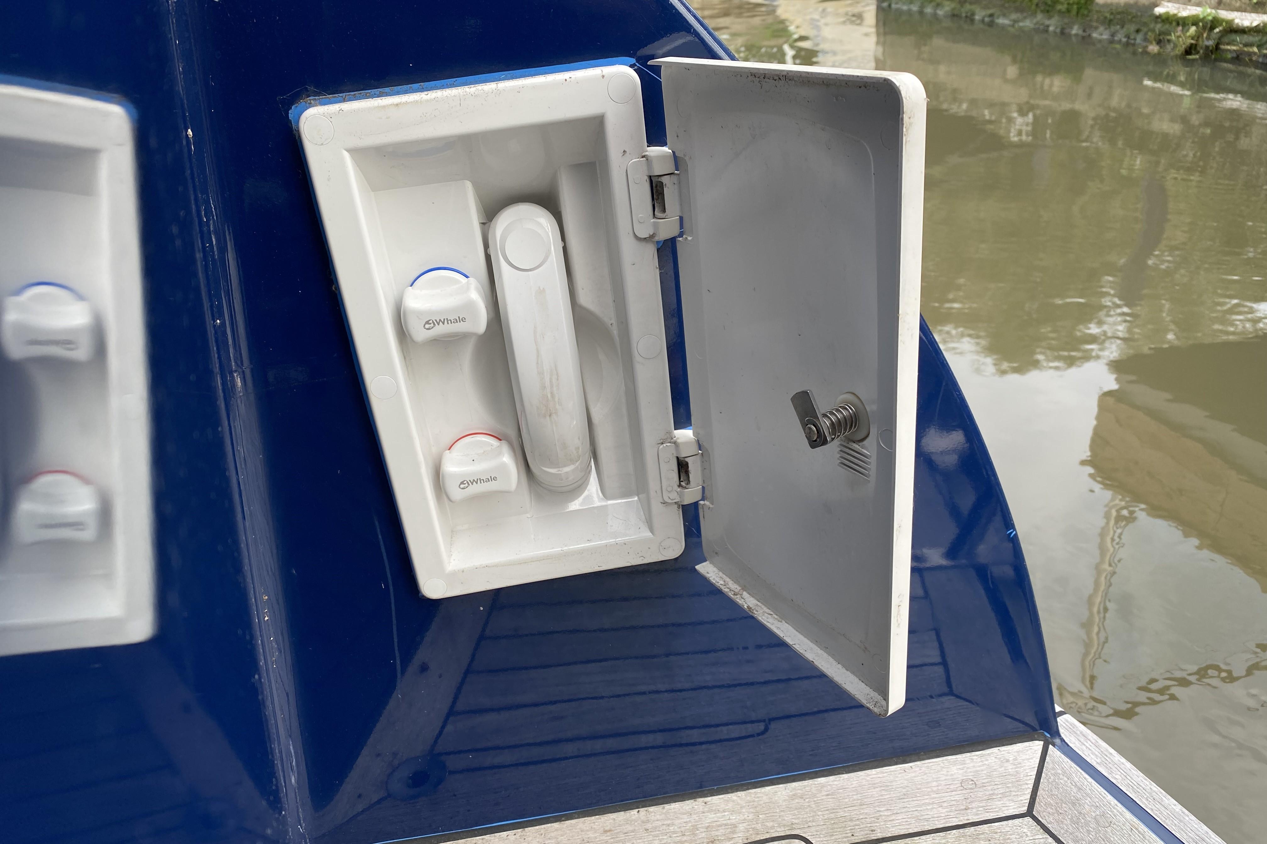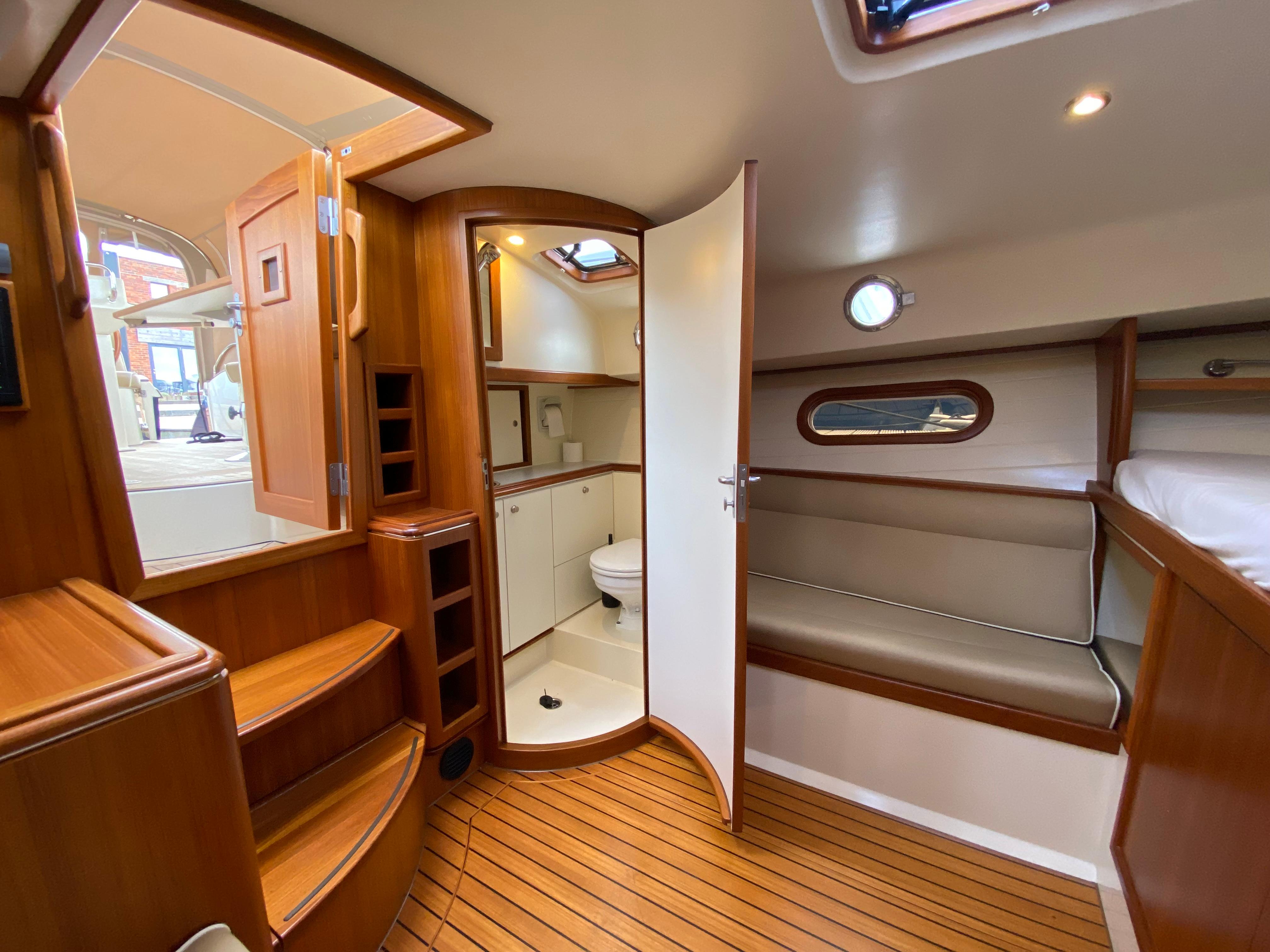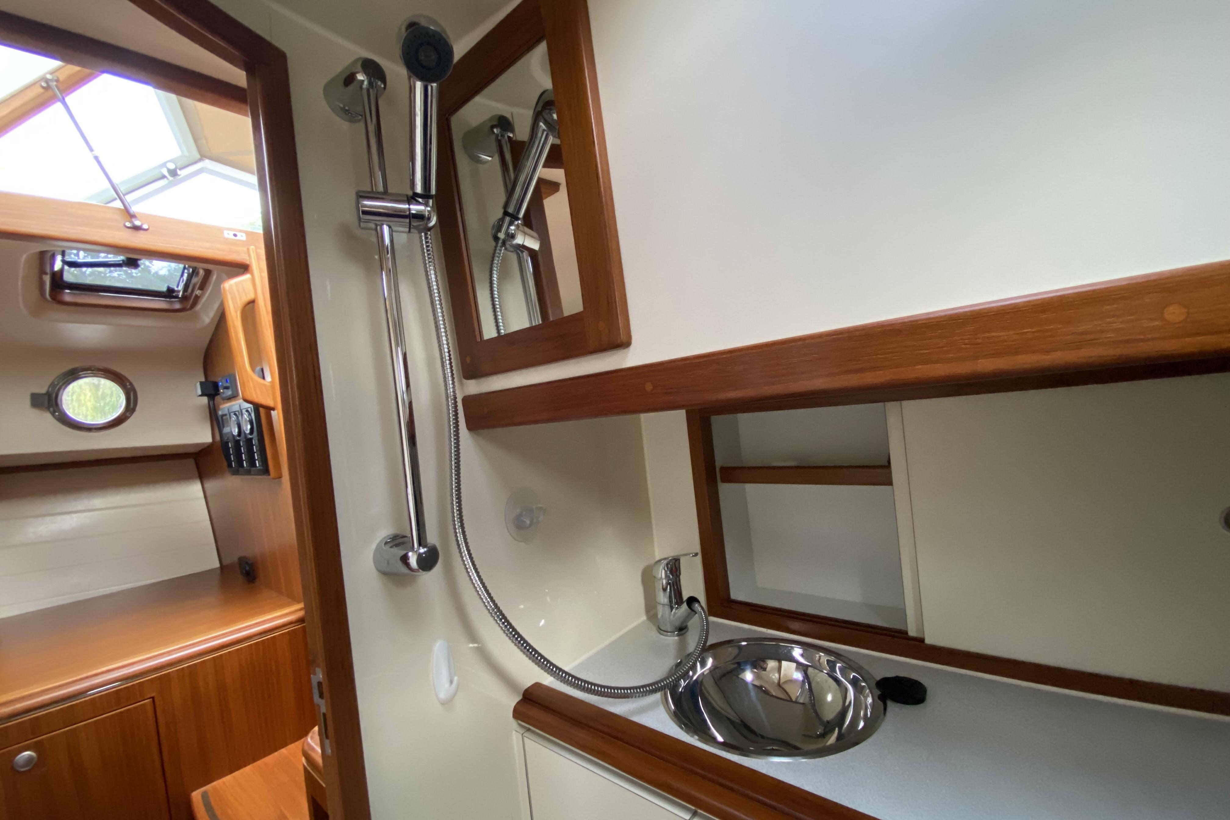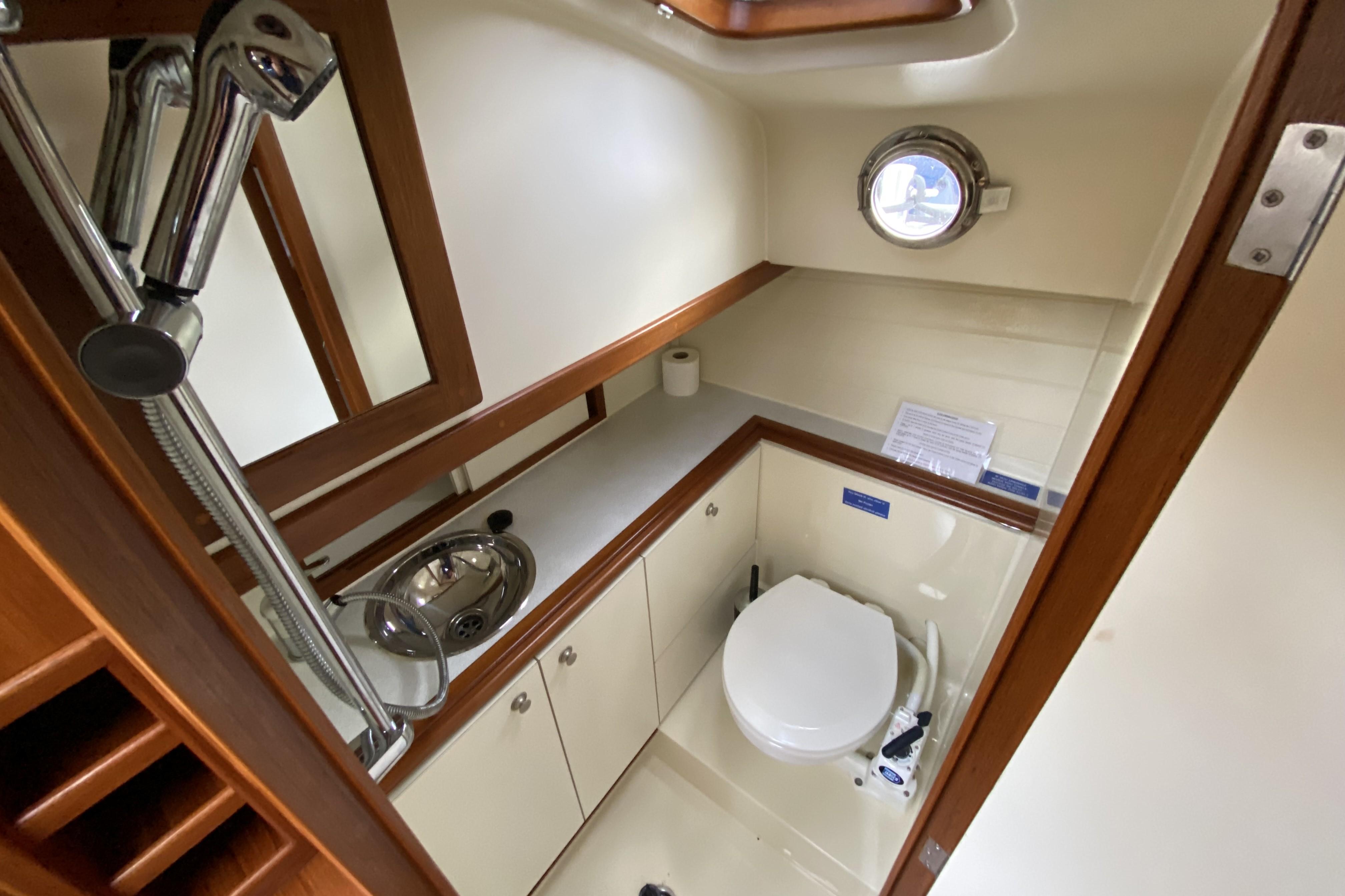 Cabin - On the ports side, toilet compartment with pump toilet to holding tank, stainless steel sink with mixer tap and hand shower attachment. Cupboards above and below. Additional 12v and 240v sockets.