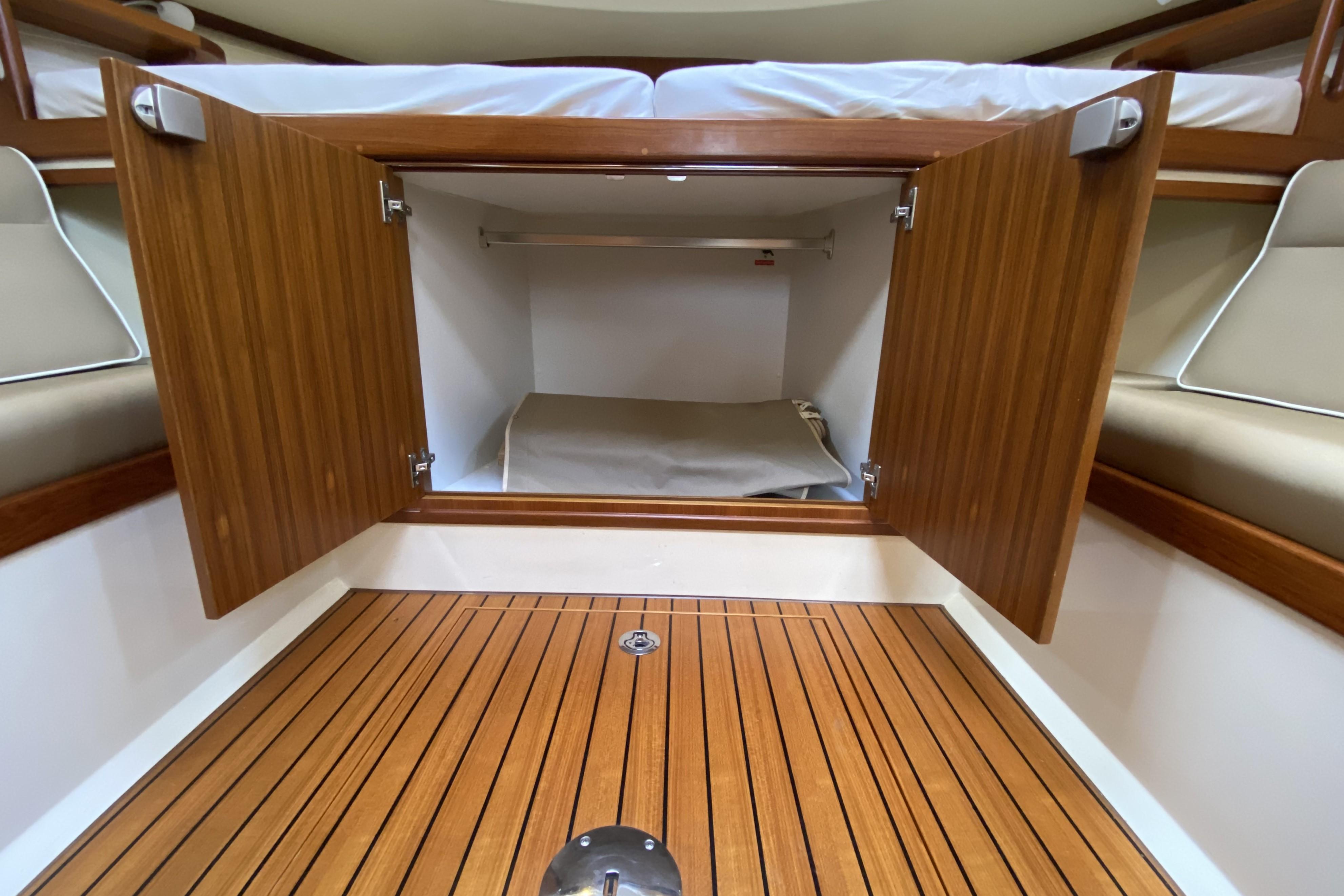 Raised double berth with wardrobe below providing hanging rail and further further storage below. Single berths to both sides extending under double berth. On the starboard side, main control panel and cupboard giving storage and access to battery master switches.