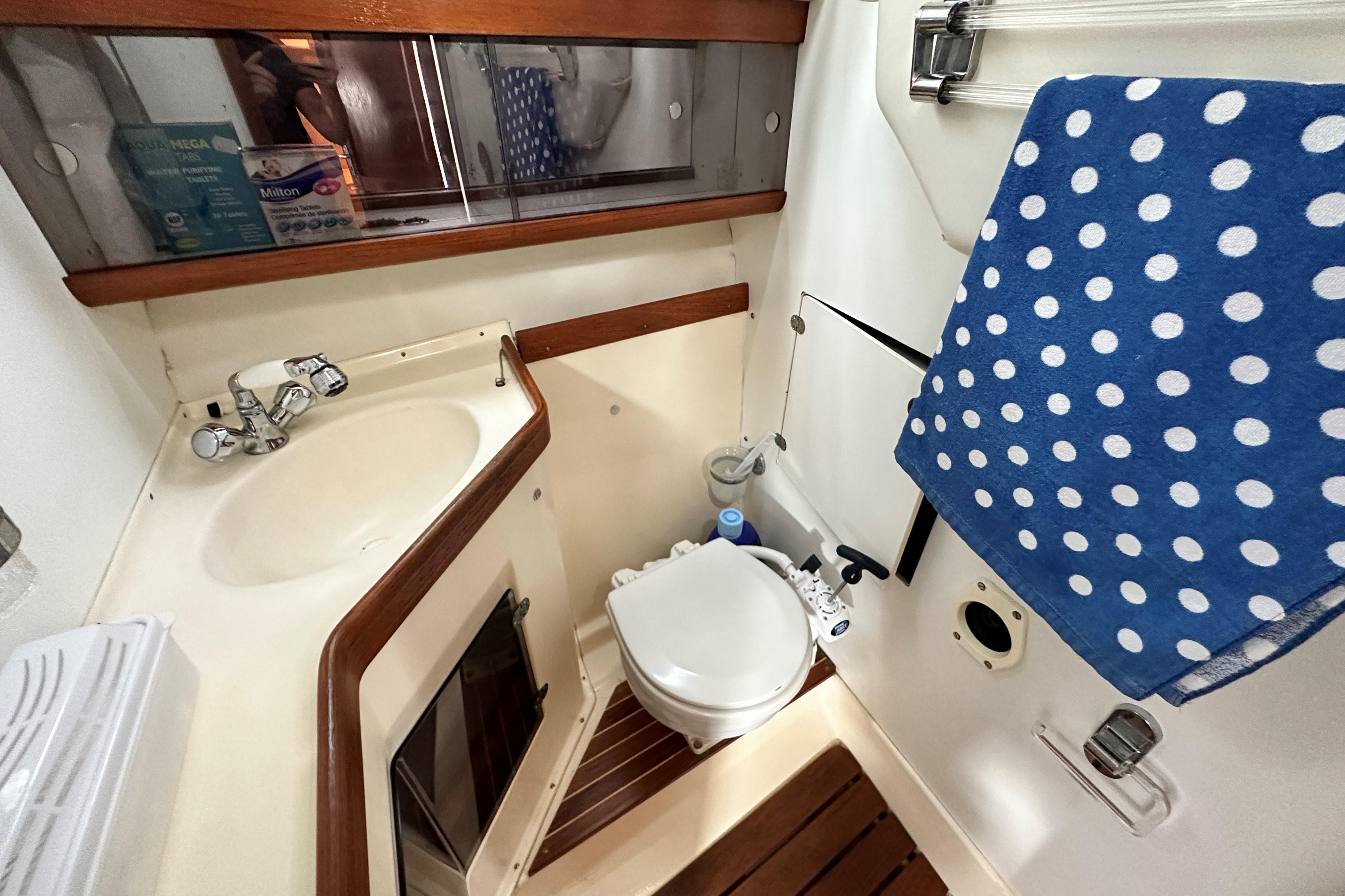 Access to to heads with pump flush toilet (to holding tank) and washbasin