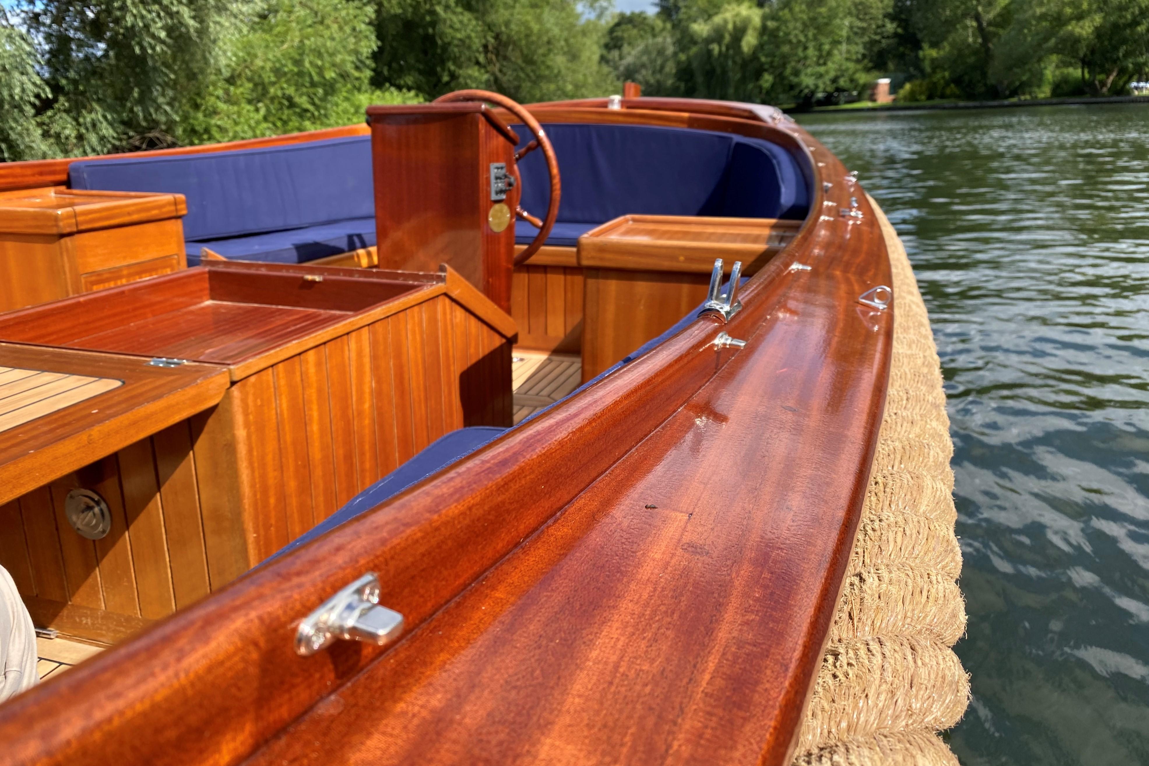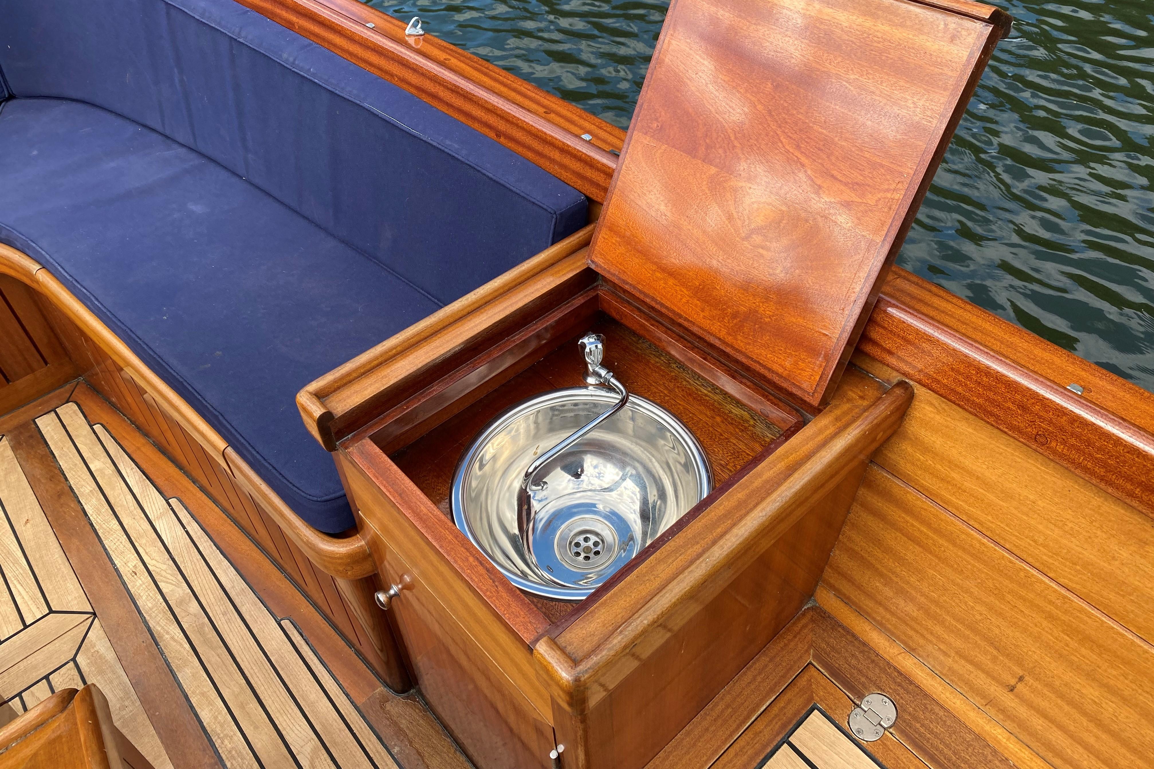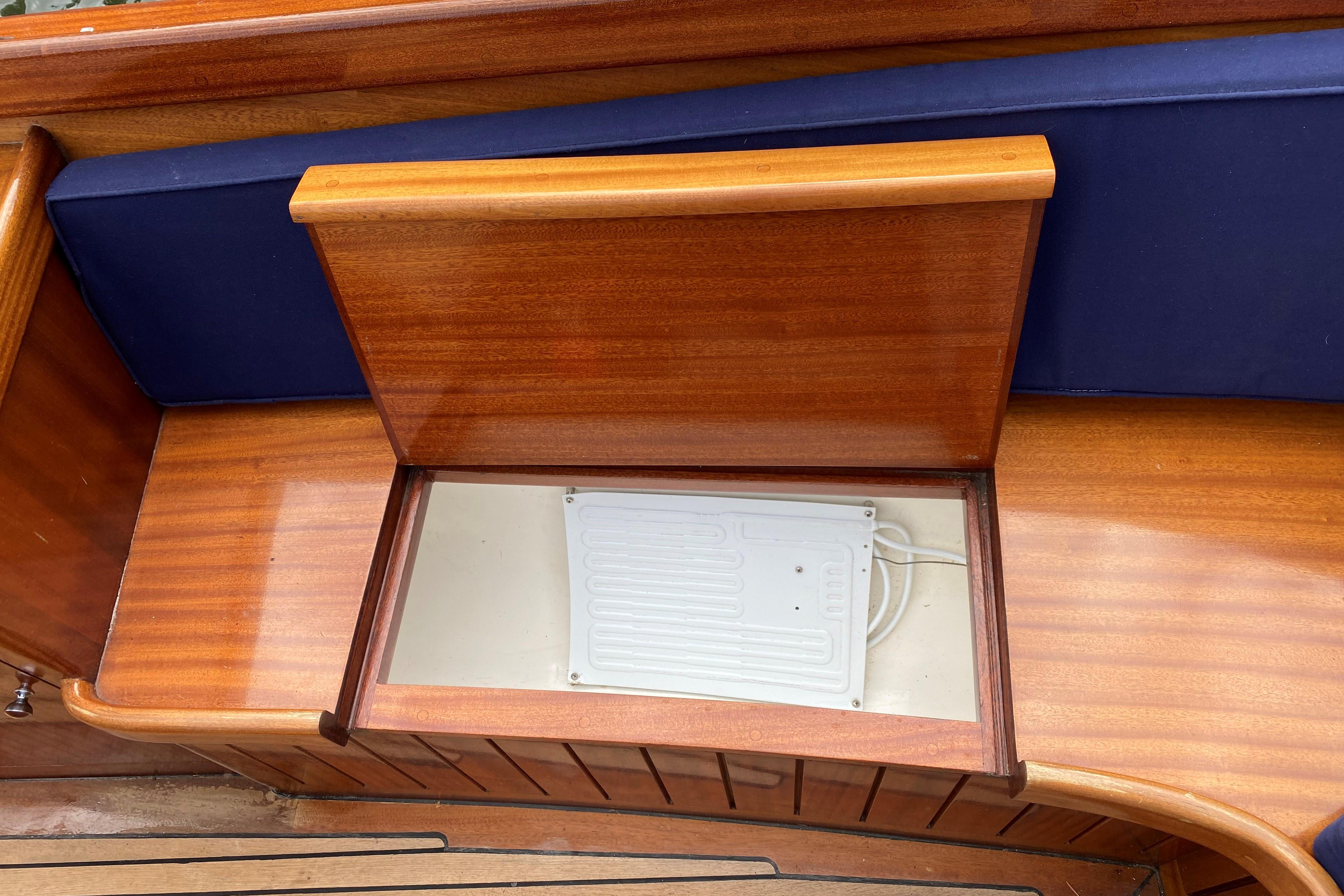 This boat will seat six people in a comfortable, social environment and has some great creature comforts cleverly disguised under the mahogany and teak. These include a sink with fresh running water, compressor cooled locker (fridge), locking box, fold out table and lots of storage space under the seating.
