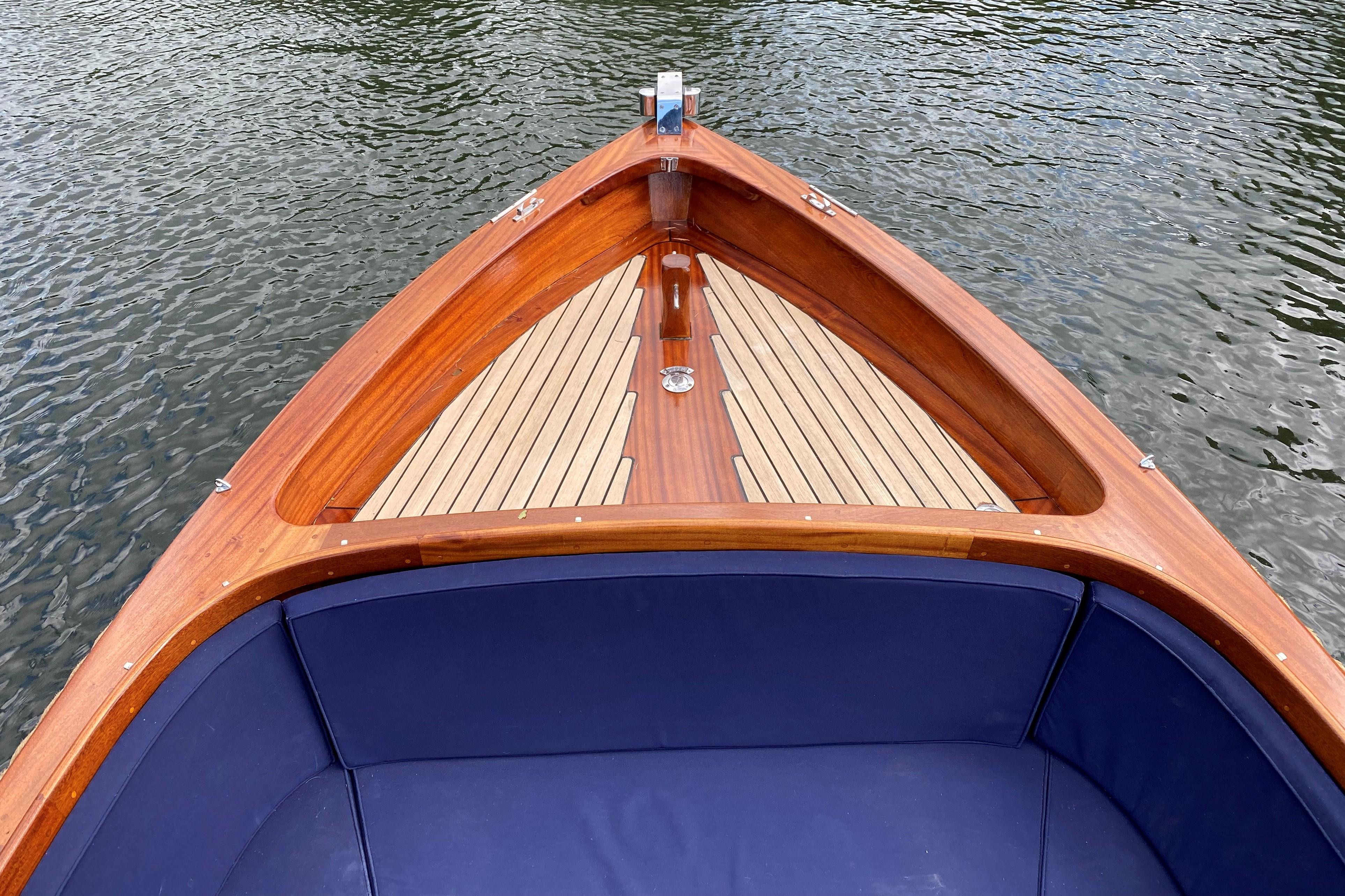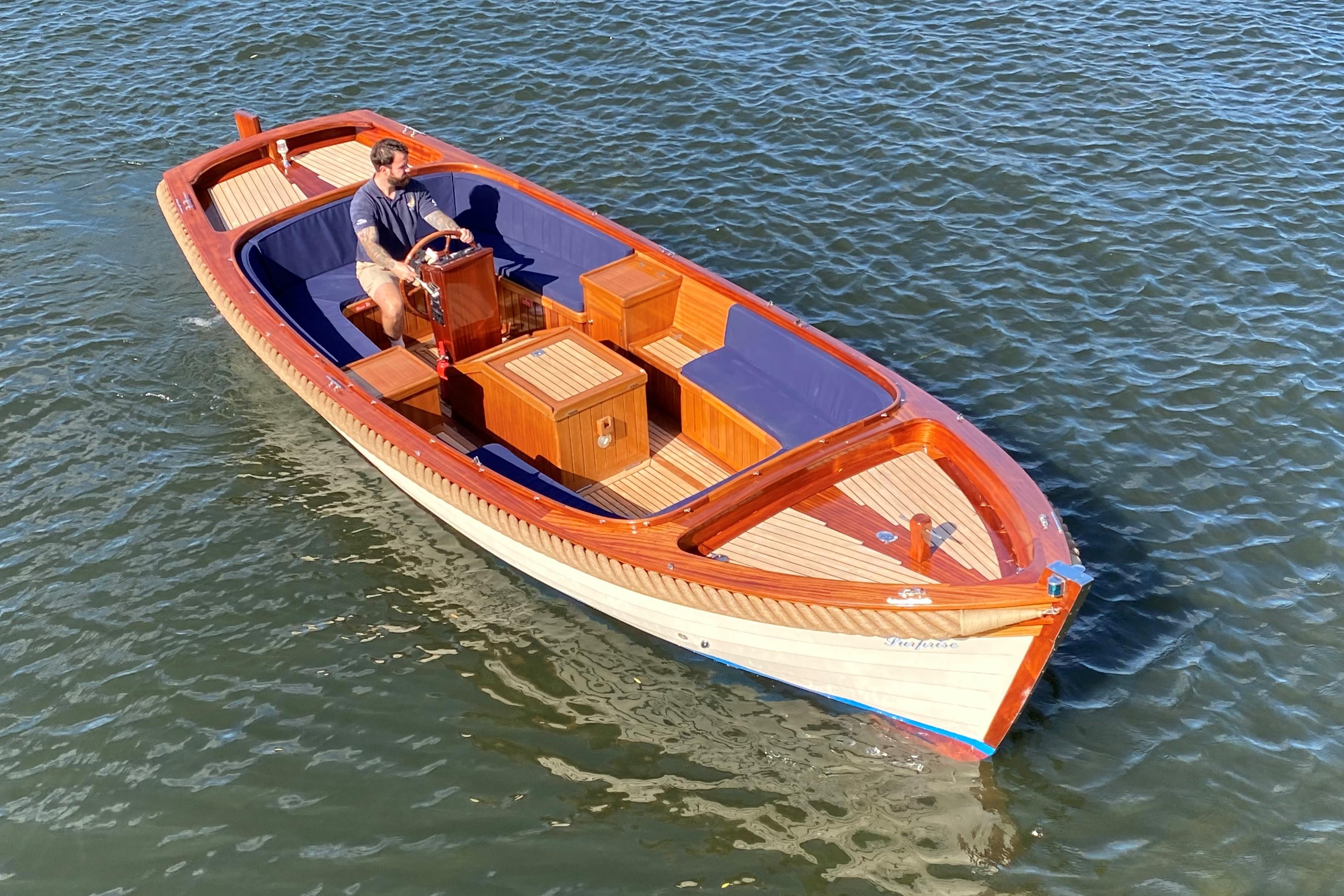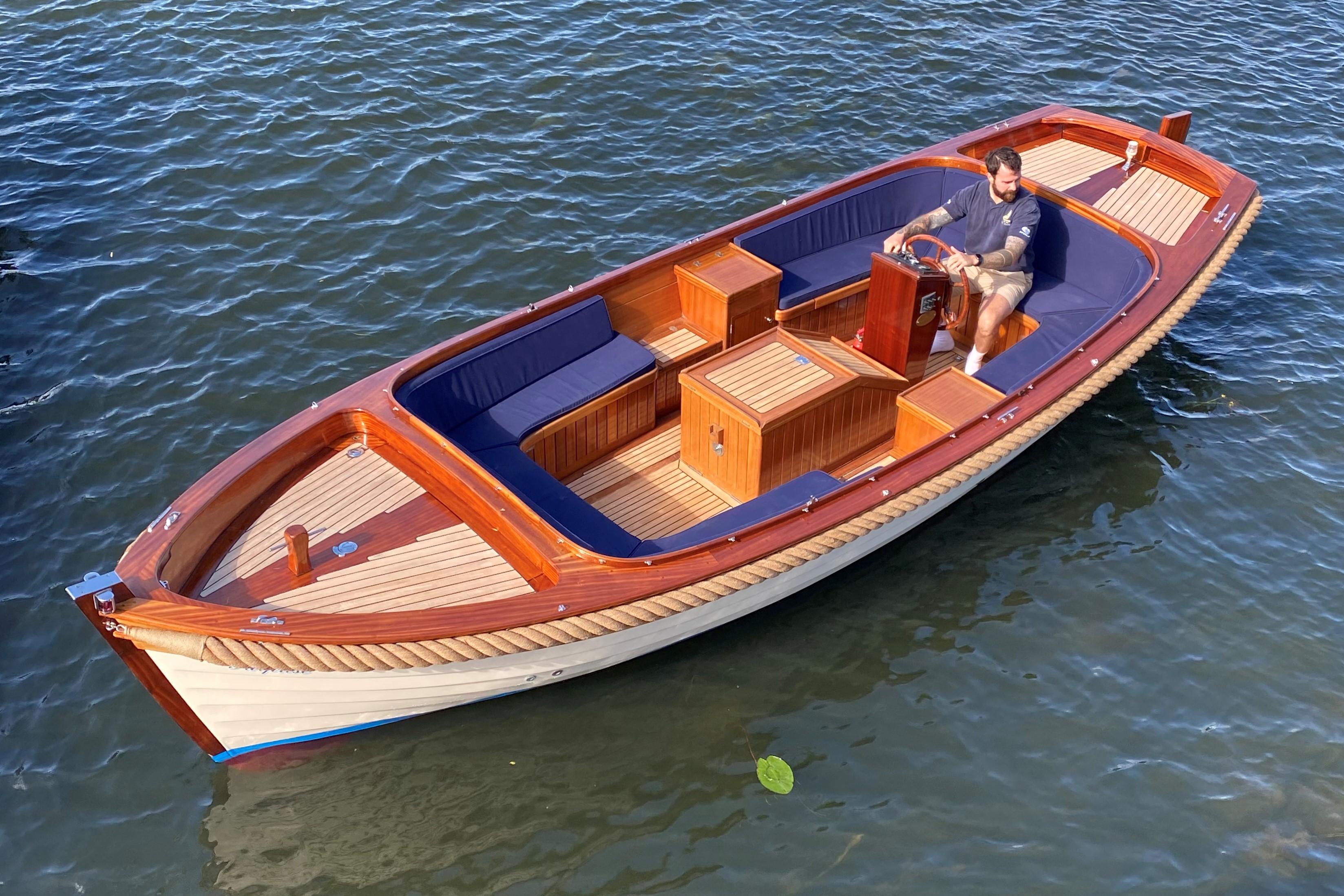 This boat will seat six people in a comfortable, social environment and has some great creature comforts cleverly disguised under the mahogany and teak. These include a sink with fresh running water, compressor cooled locker (fridge), locking box, fold out table and lots of storage space under the seating.